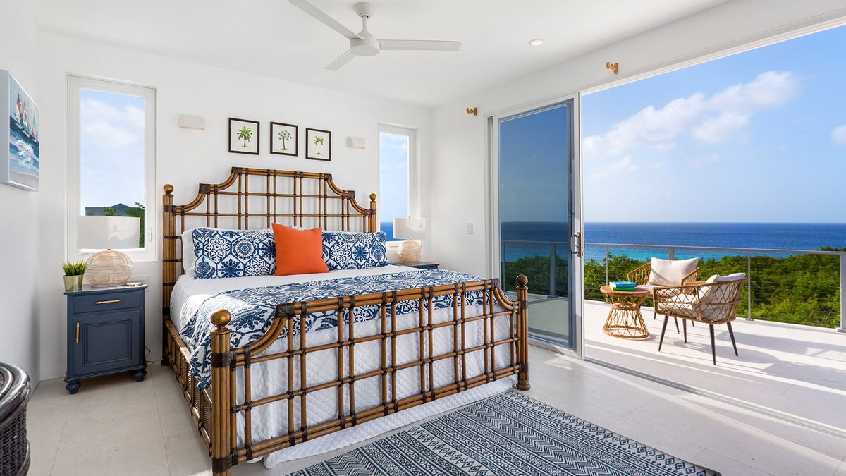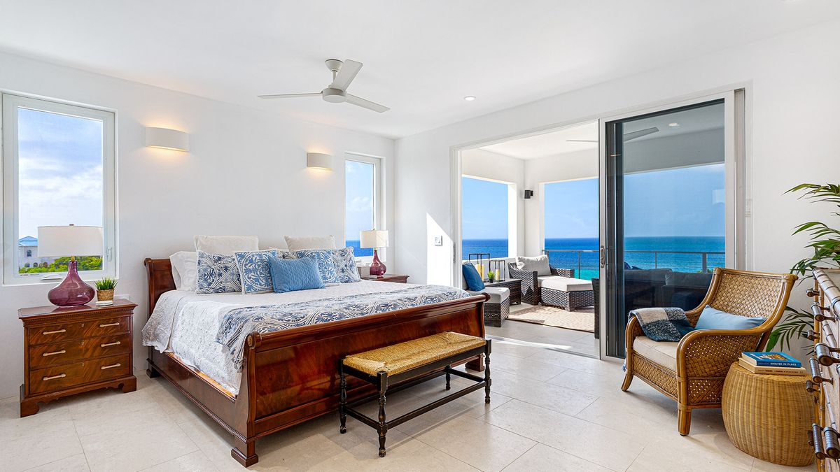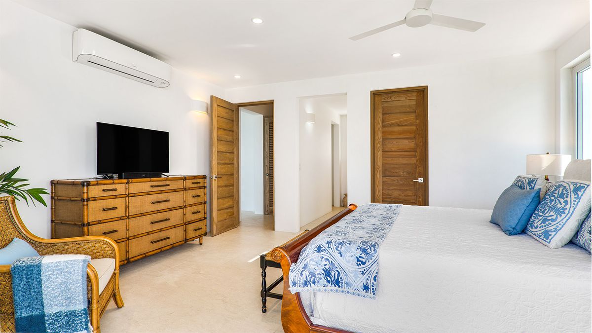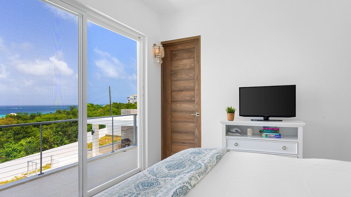 Bedroom 4 is also located on the second level and has a queen-sized bed. The en-suite bathroom includes a shower. Air conditioning and a ceiling fan maintain a comfortable atmosphere. A television is available for guests’ enjoyment. The room shares a balcony with another room, providing shared ocean views.