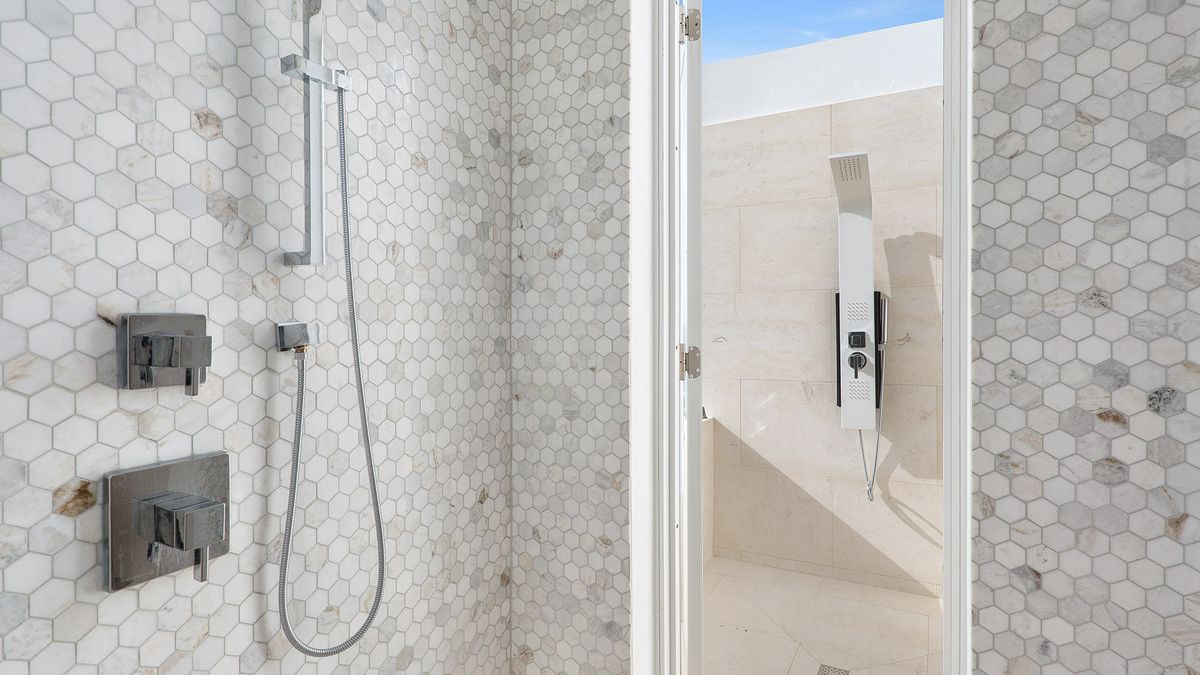 Master Bedroom 1 is located on the first level and features a king-sized bed. The en-suite bathroom includes a bathtub and shower. Air conditioning and a ceiling fan maintain a comfortable temperature. The room offers direct access to a furnished terrace and the pool, where guests can enjoy stunning ocean views.