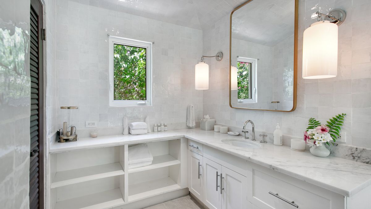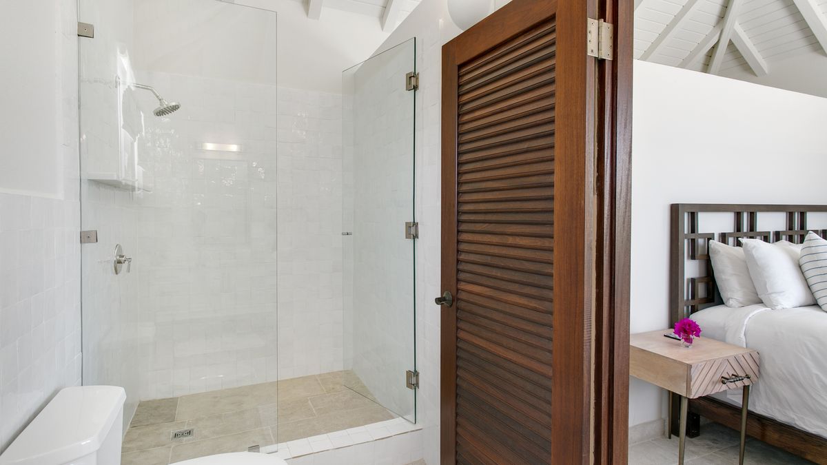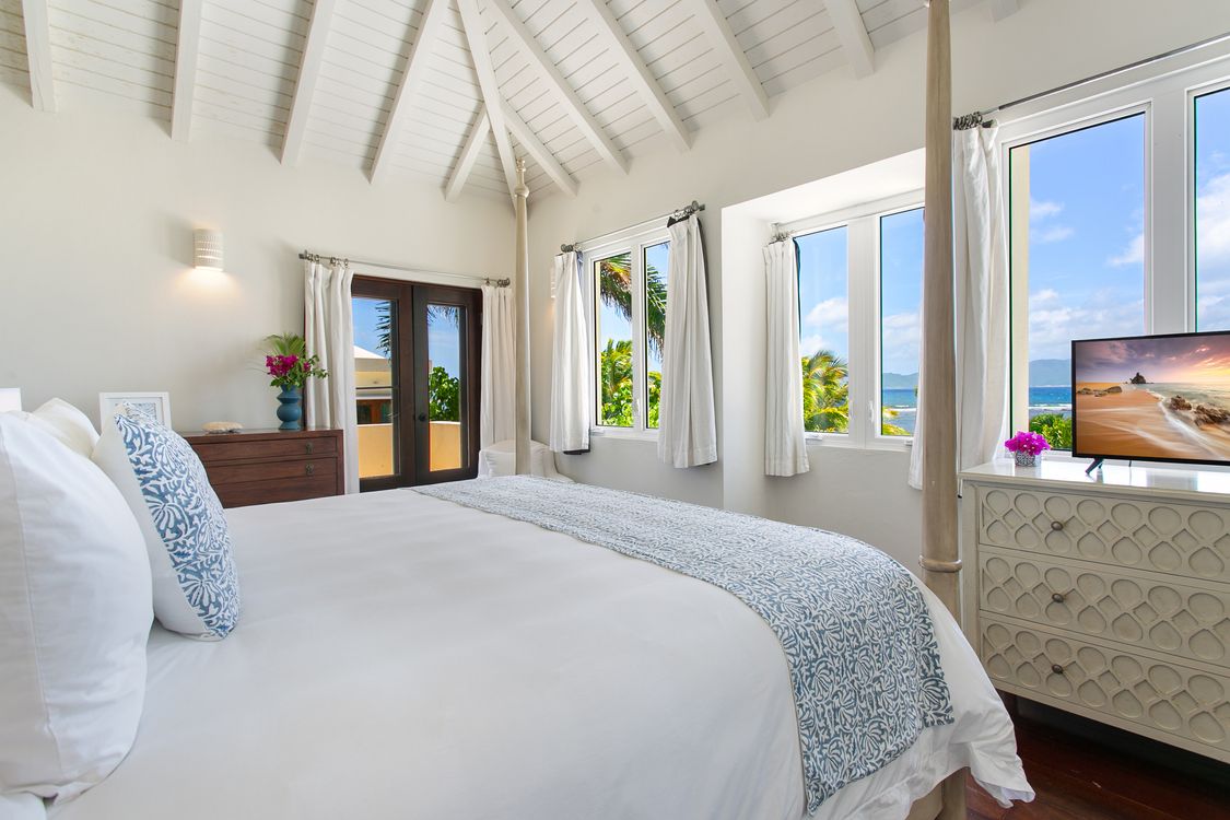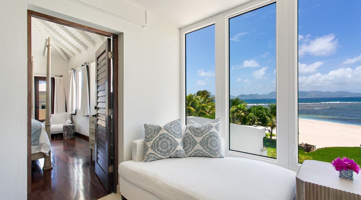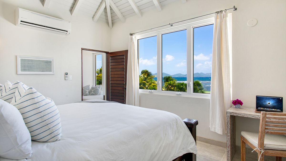 The five elegant bedroom suites all have ensuite baths — two of the suites are in the modern main house, and three of the self-contained suites are found in the adjacent guest house. Designed for up to 10 guests, the luxury villa has views of St. Martin from nearly every room.