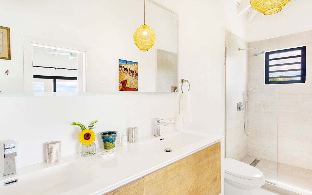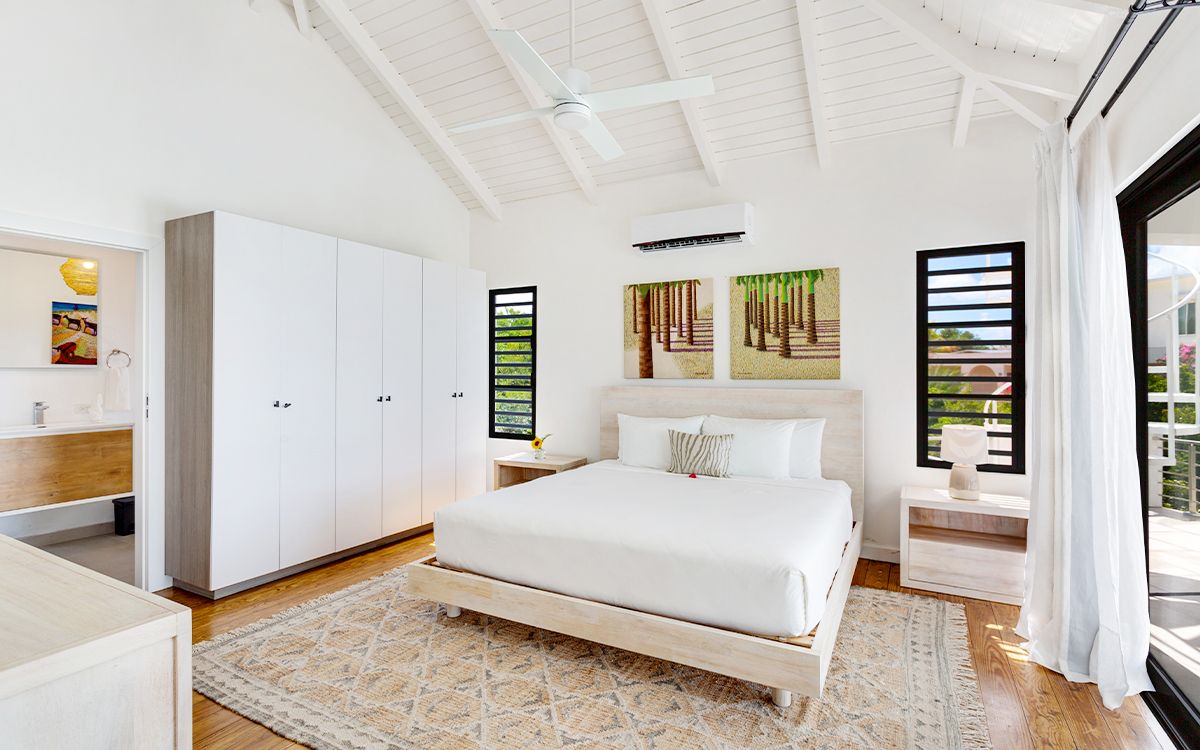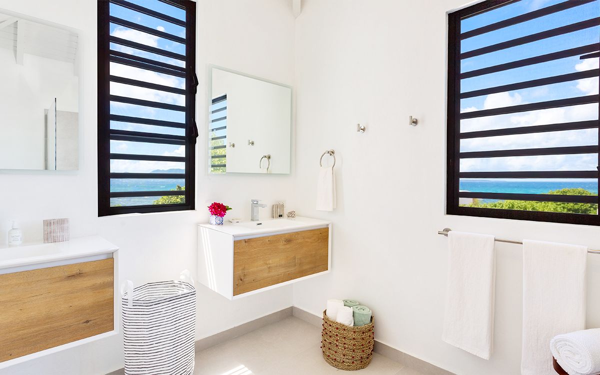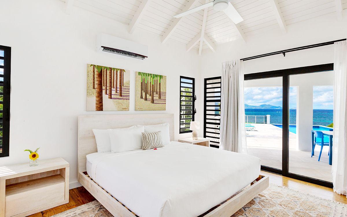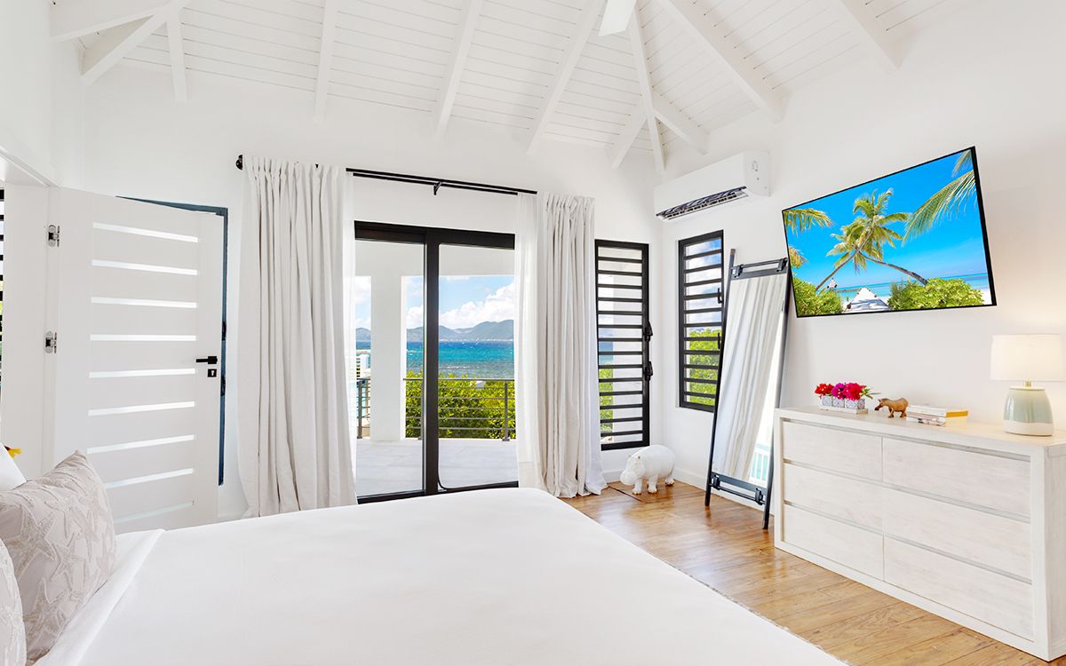 En-suite bathroom with walk-in shower, double vanity, air conditioning, ceiling fan, television, bedside charging ports, opens onto furnished pool terrace with Caribbean sea view.