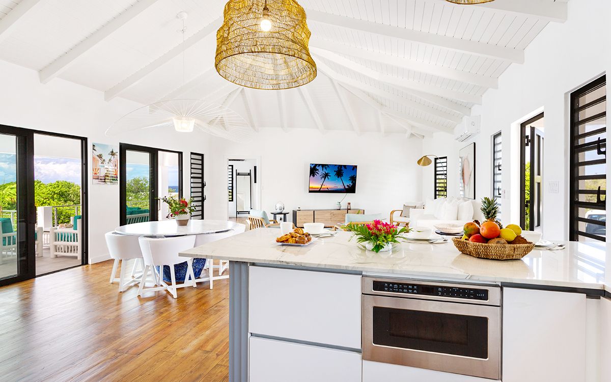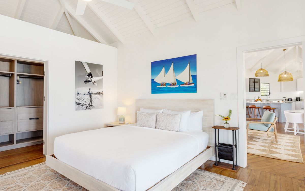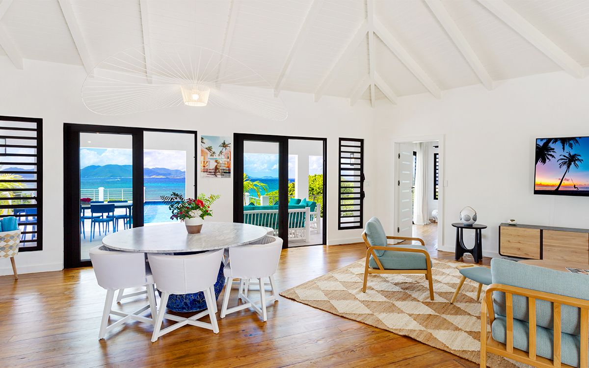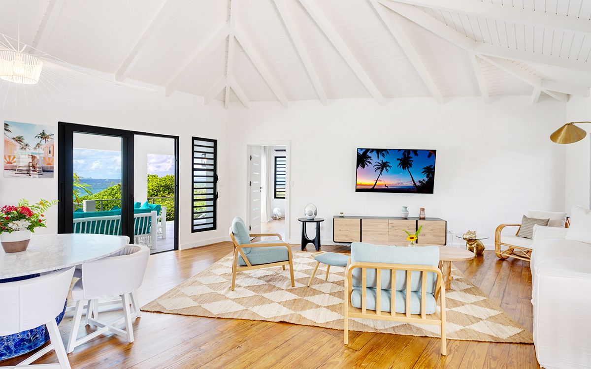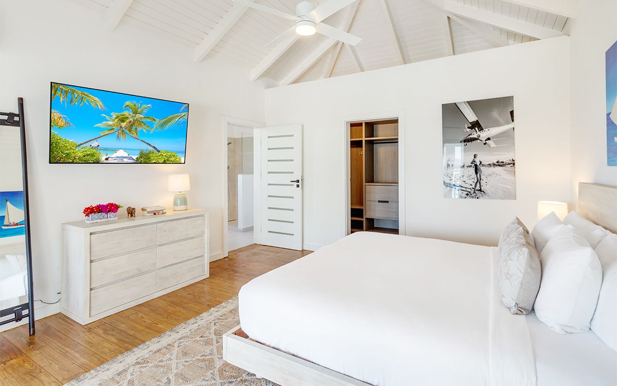 En-suite bathroom with walk-in shower, double vanity, air conditioning, ceiling fan, television, bedside charging ports, opens onto furnished pool terrace with Caribbean sea view.