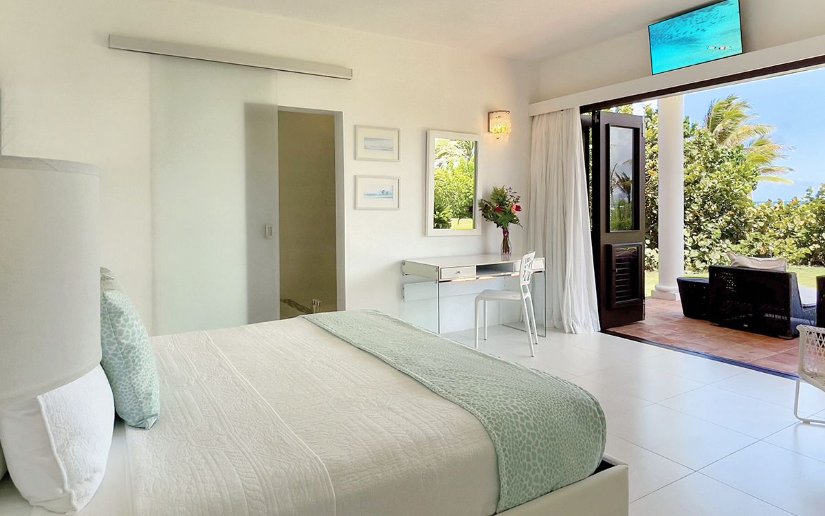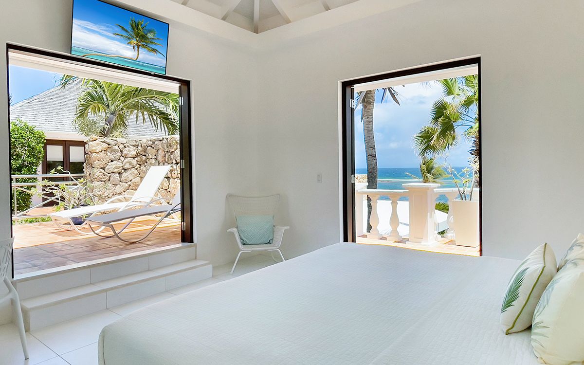 Upper level: En-suite bathroom with walk-in shower, double vanity, walk-in closet, air conditioning, ceiling fan, television, opens onto a private furnished balcony overlooking Anguilla Channel and distant St. Martin island.