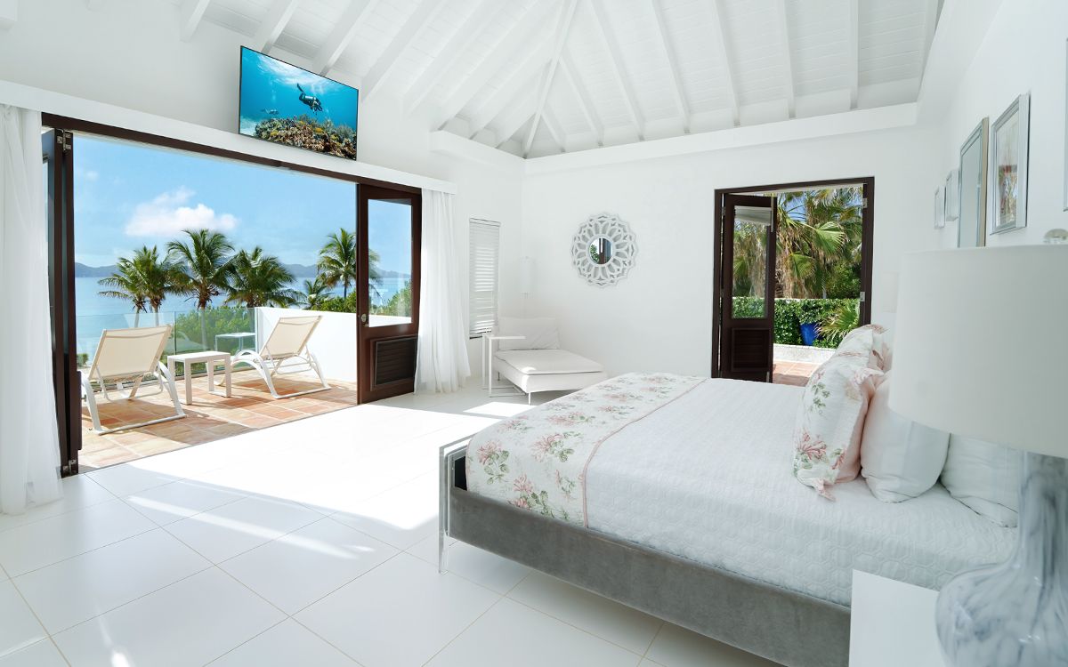 Upper level: En-suite bathroom with indoor and outdoor shower garden, double vanity, air conditioning, ceiling fan, television opens onto private furnished porch area on one side and pool terrace on other side, with views of Anguilla Channel and distant St. Martin island.