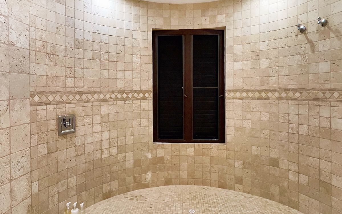 Lower level: En-suite bathroom with walk-in shower, double vanity, private furnished porch with views of Anguilla Channel and distant St. Martin island.