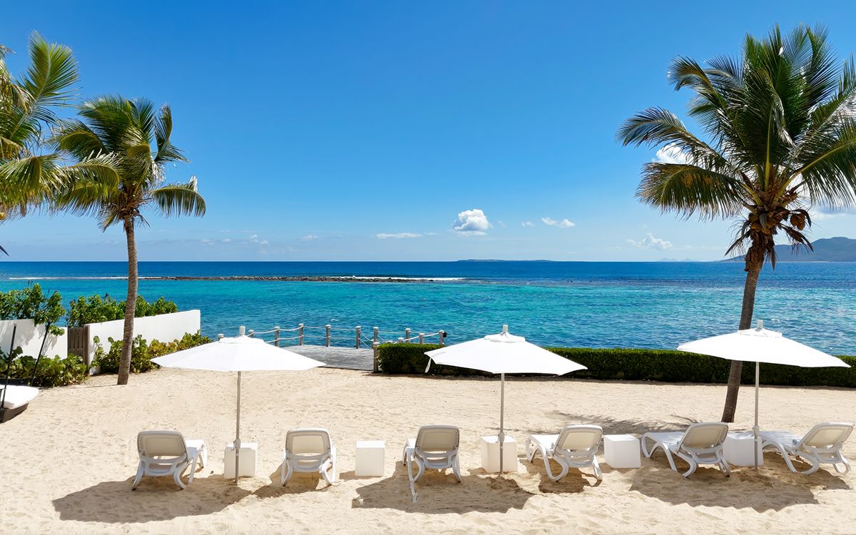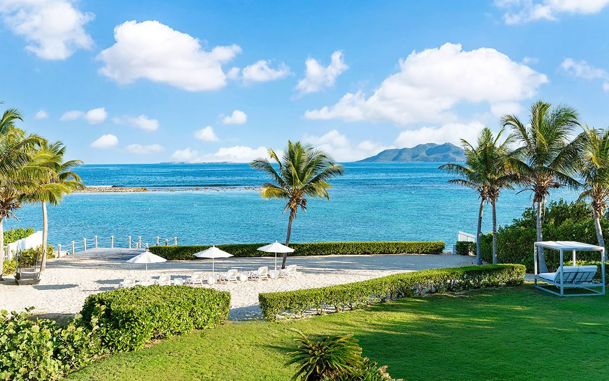 Lower level: En-suite bathroom with walk-in shower, double vanity, walk-in closet, air conditioning, ceiling fan, television, opens onto furnished terrace with views of Anguilla Channel and distant St. Martin island. Upon request, queen beds can be combined to form a super king-size bed.