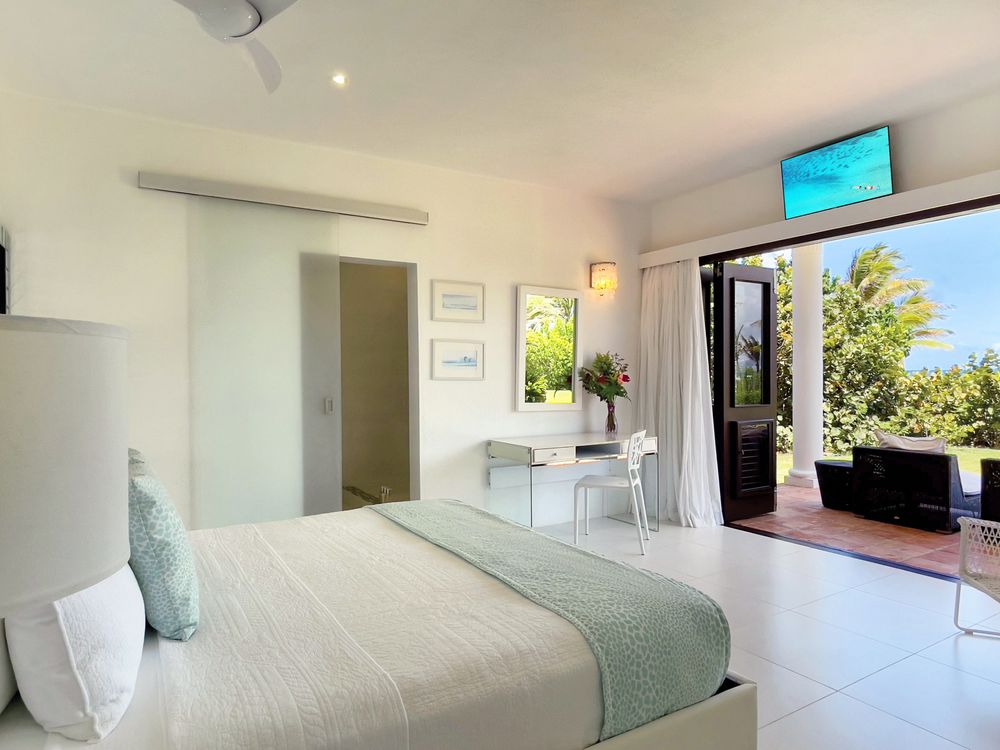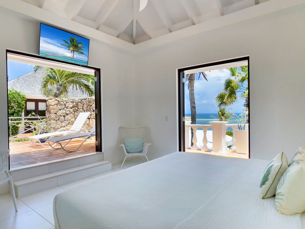 The villa’s recent refurbishment has enhanced its aesthetic, with bright, pristine white interiors highlighting the vibrant blues of the Caribbean Sea and the lush greenery of the gardens. Each bedroom suite is a private haven, offering a serene escape with its outdoor shower and balcony or terrace, allowing guests to fully embrace the island’s natural beauty.
