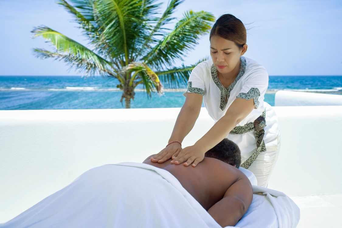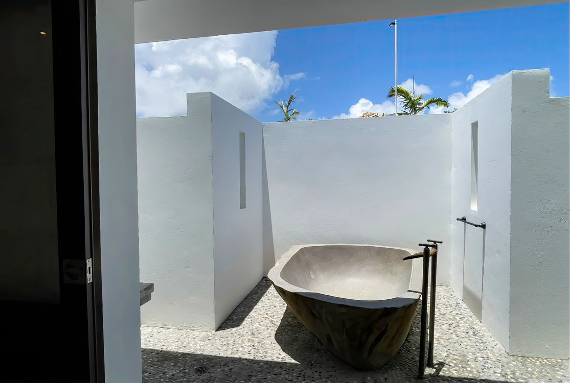 Finally, the Le Bleu Garden Suites provide additional luxurious accommodations not far from the Blowing Point. These suites include two king-size bedrooms, each with its en-suite bathroom that opens to an outdoor bathing area featuring stunning natural stone tubs and basins.