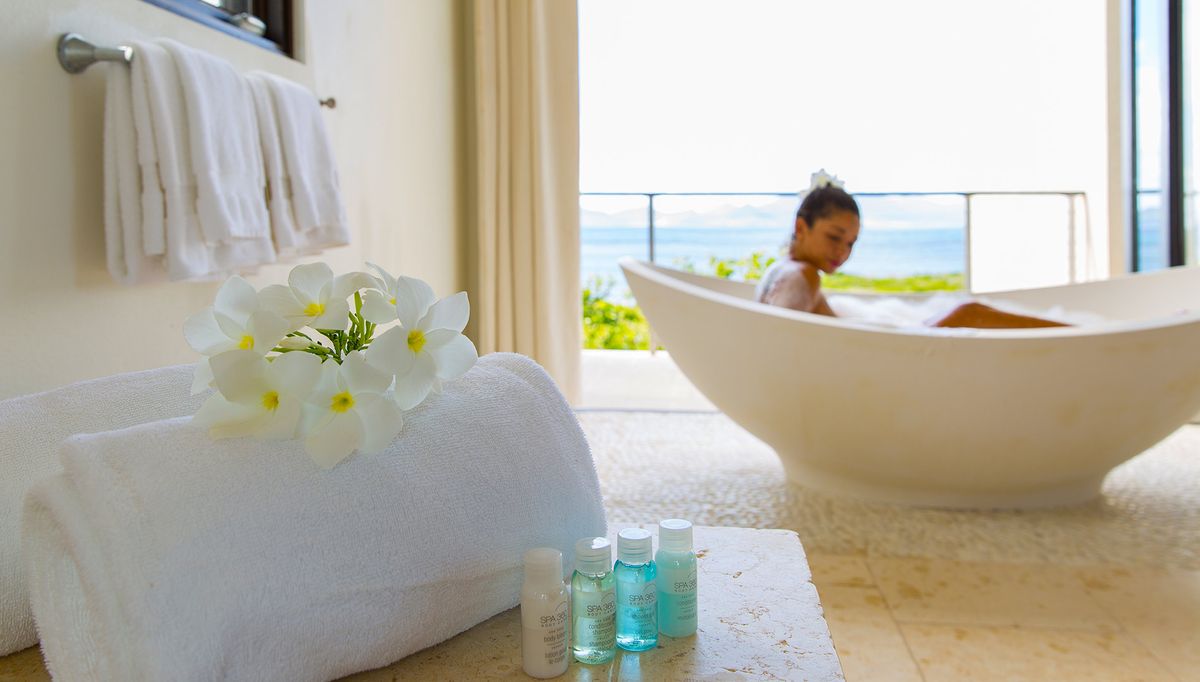 The second master bedroom is situated in the East Pavillion on the upper level. It includes a king-sized bed and an en-suite bathroom with a soaking bathtub, indoor and outdoor showers, and a double vanity. A desk, AC, television, and ceiling fan are provided. Guests can enjoy the sea view from the furnished terrace.
