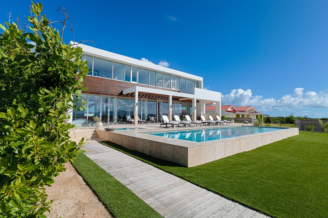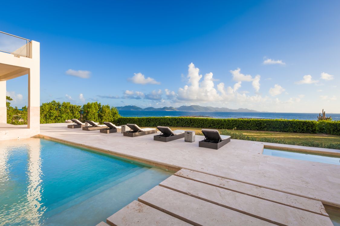 The villa's spacious terrace offers panoramic views of the azure waters of the Caribbean Sea, with the island of St. Martin visible in the distance. This outdoor space is further enriched by an inviting pool and a separate Jacuzzi, both perfectly integrated into the villa's design. Just steps away, the sea invites you to explore, with an outdoor shower conveniently located to rinse off after a day of sun and sand.
