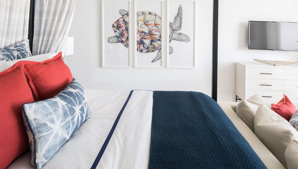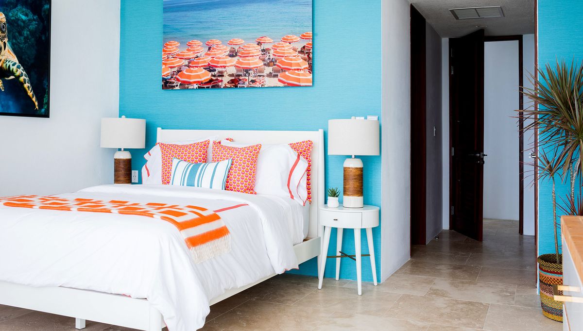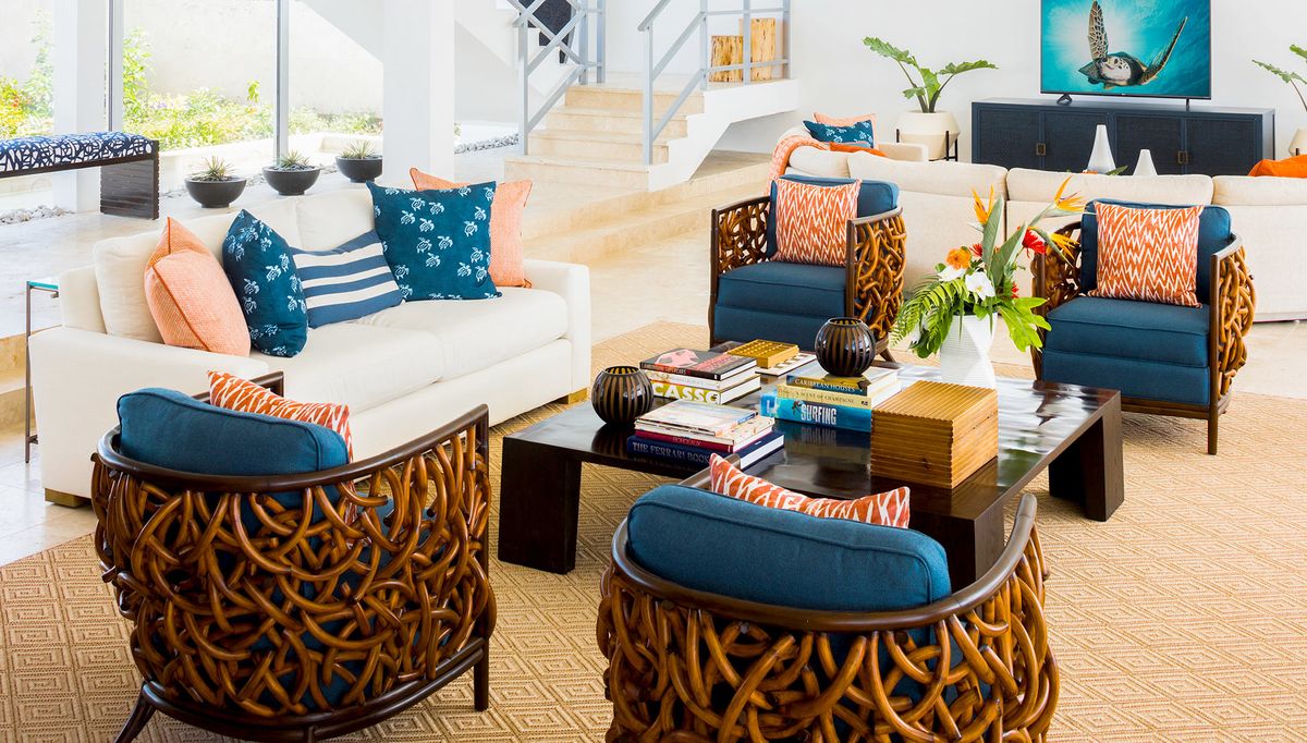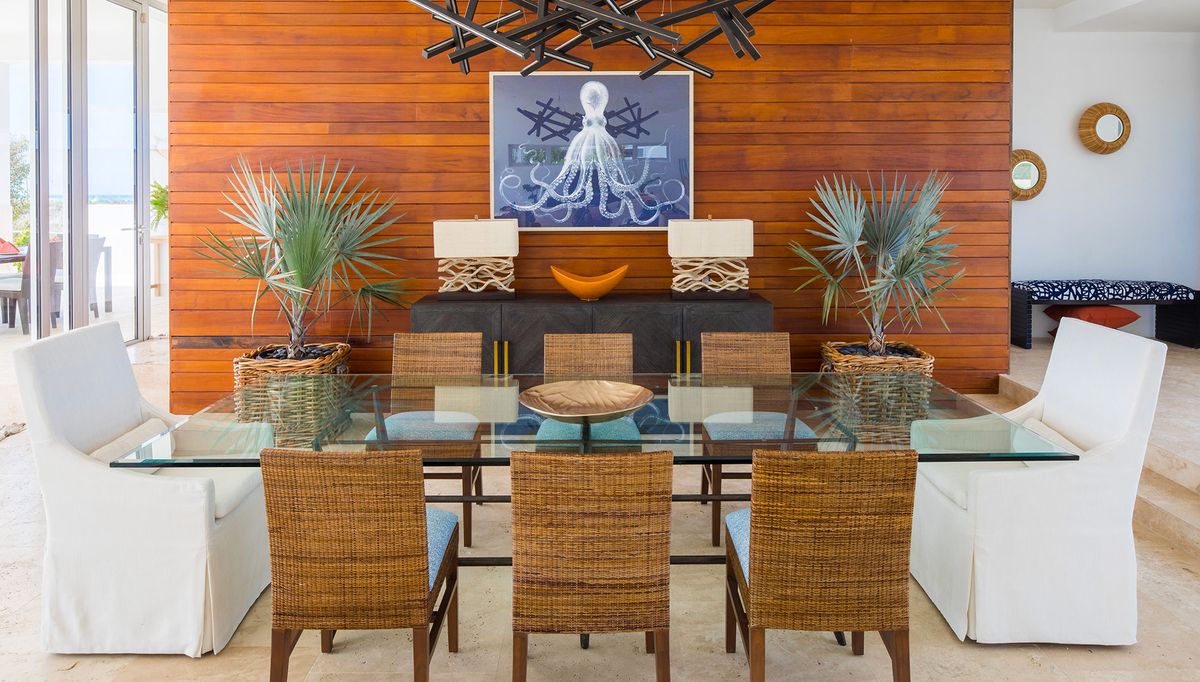 Two distinct living areas and a dining table that comfortably accommodates eight people create an open-concept living room that will draw much of the guest's attention to this Lockrum villa. Yet, what truly becomes the attraction of the living room are the panoramic ocean views that fill the space with natural light and beauty. The modern kitchen, with its turquoise backsplash and sleek white cabinetry, reflects the colors of the ocean.