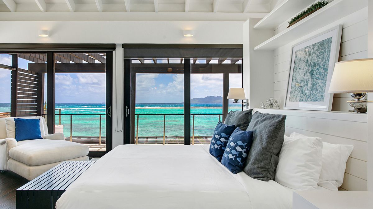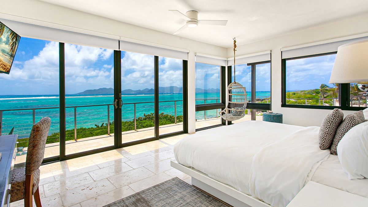 Master Bedroom 1 is located on the main level and features a king-size bed. The en-suite bathroom boasts a freestanding tub, indoor and outdoor showers, and a double vanity. Air conditioning, a ceiling fan, and a television are provided. A desk is available for work or relaxation. The bedroom opens onto a furnished balcony offering stunning views of the Caribbean Sea and Sint Maarten.