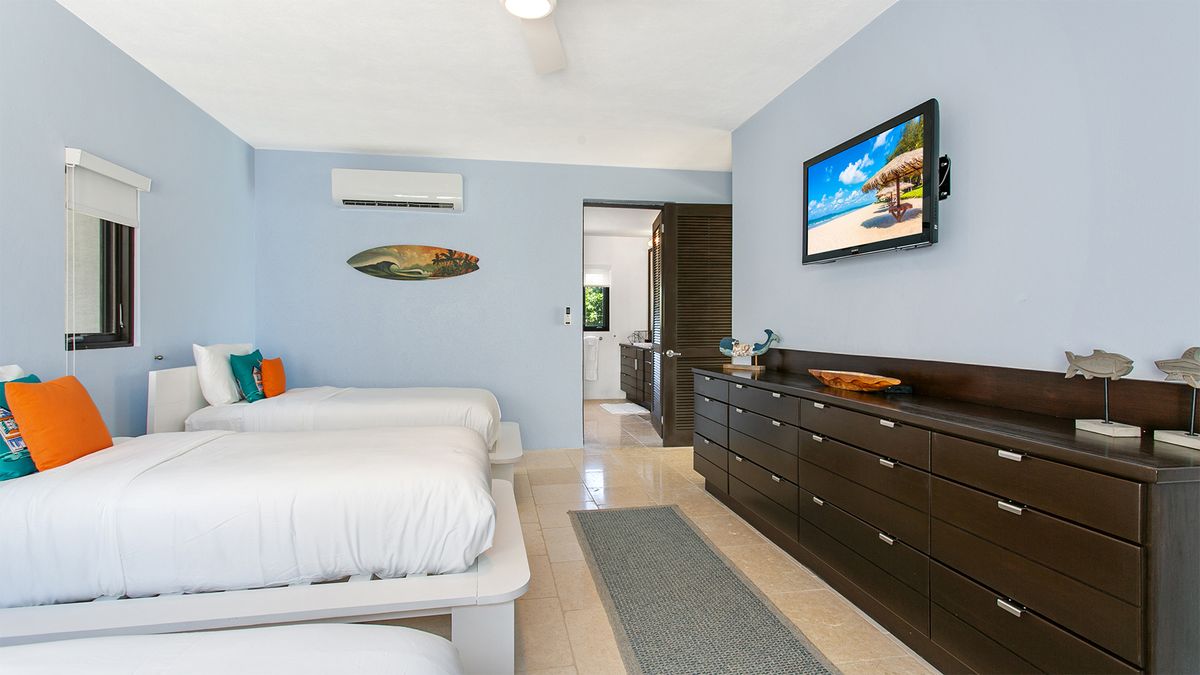 Bedroom 4 is on the lower level and has three twin beds. The en-suite bathroom includes a walk-in shower. Air conditioning and television are available.