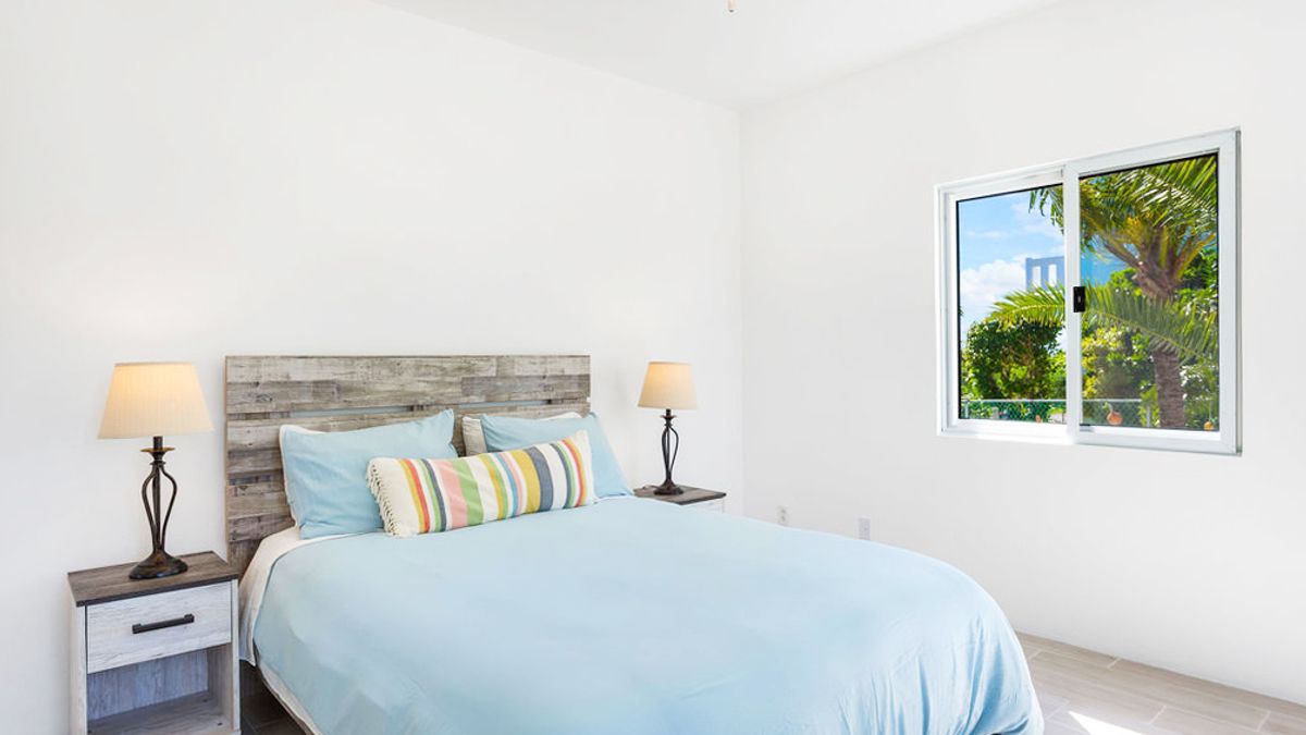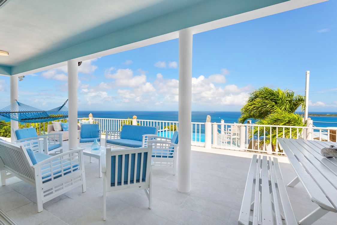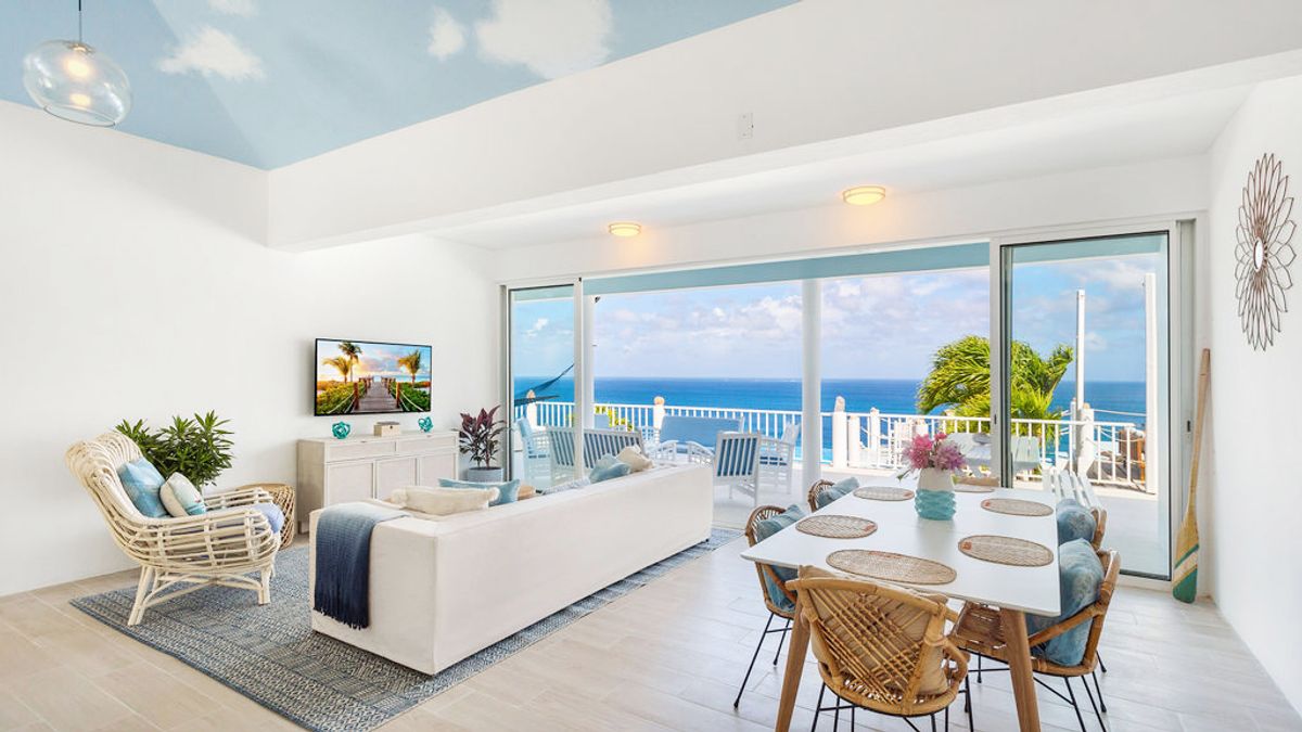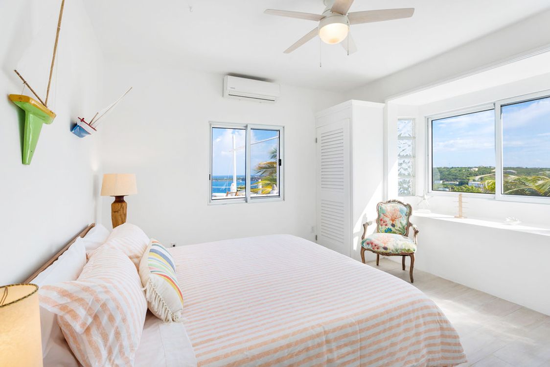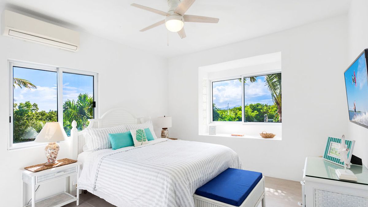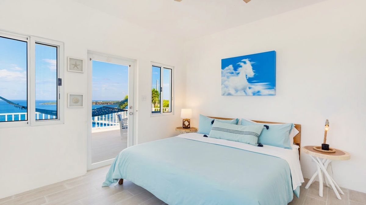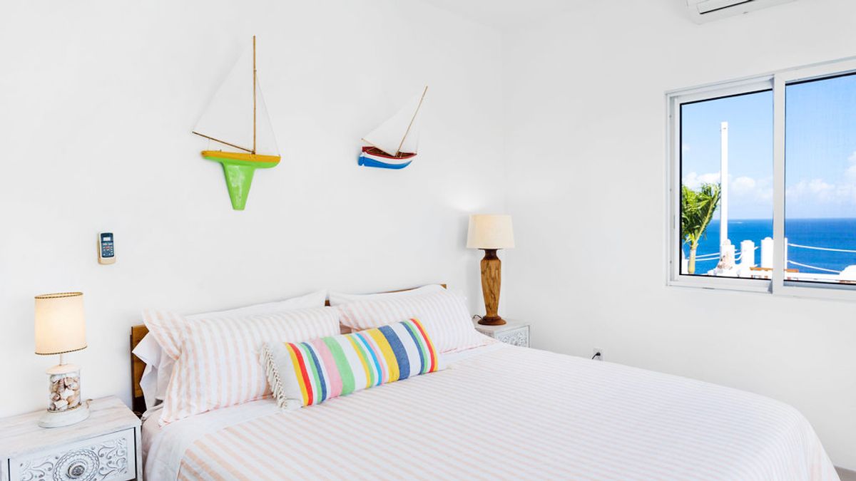 En-suite bathroom with walk-in shower, air conditioning, ceiling fan, television, opens onto furnished patio with sea view.