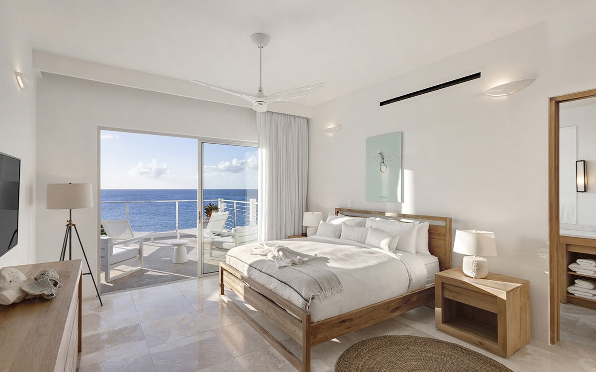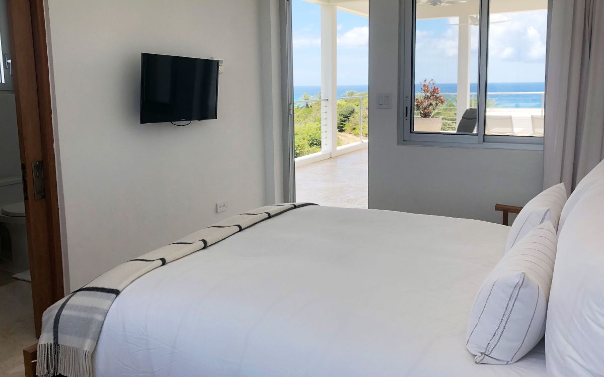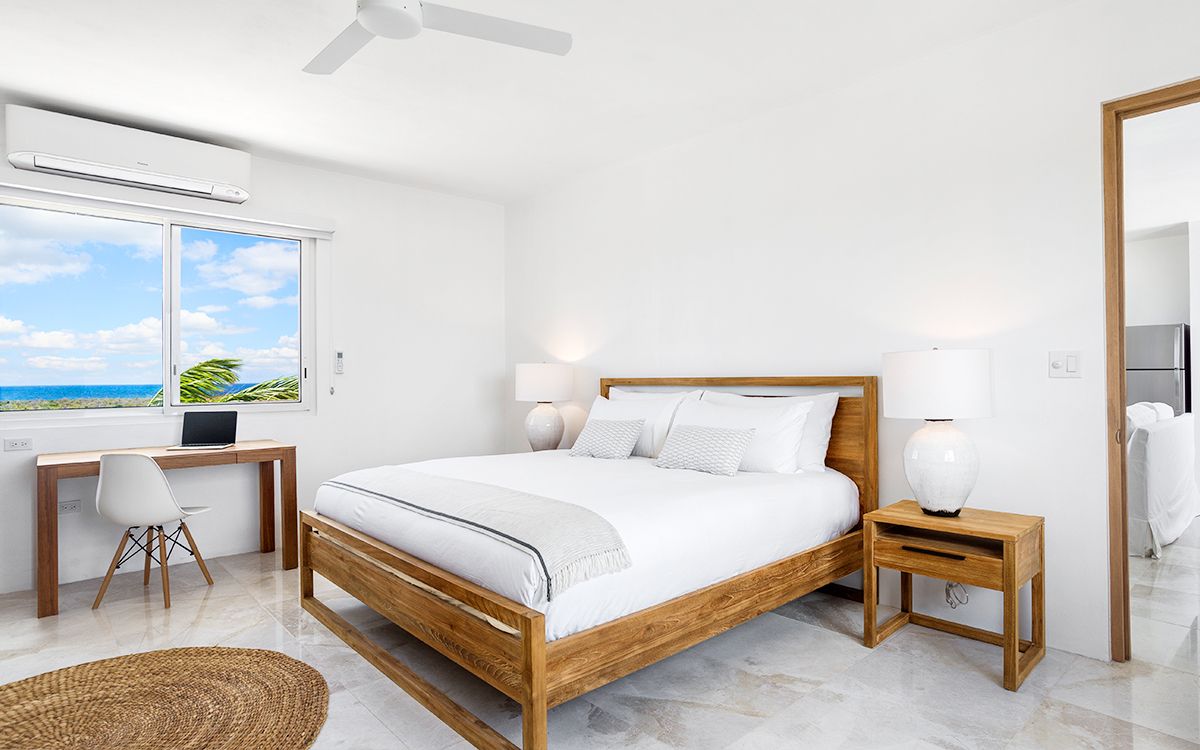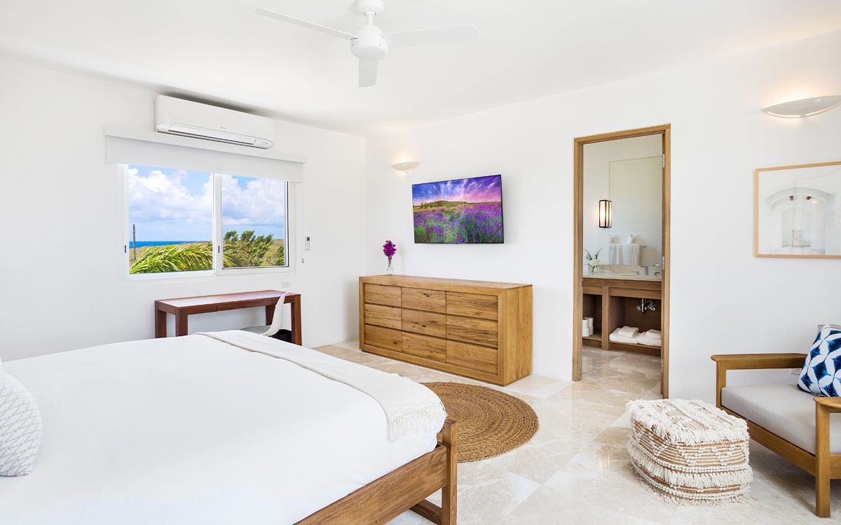 Upper level: En-suite bathroom with shower, air conditioning, ceiling fan, television, access to furnished terrace with ocean view.