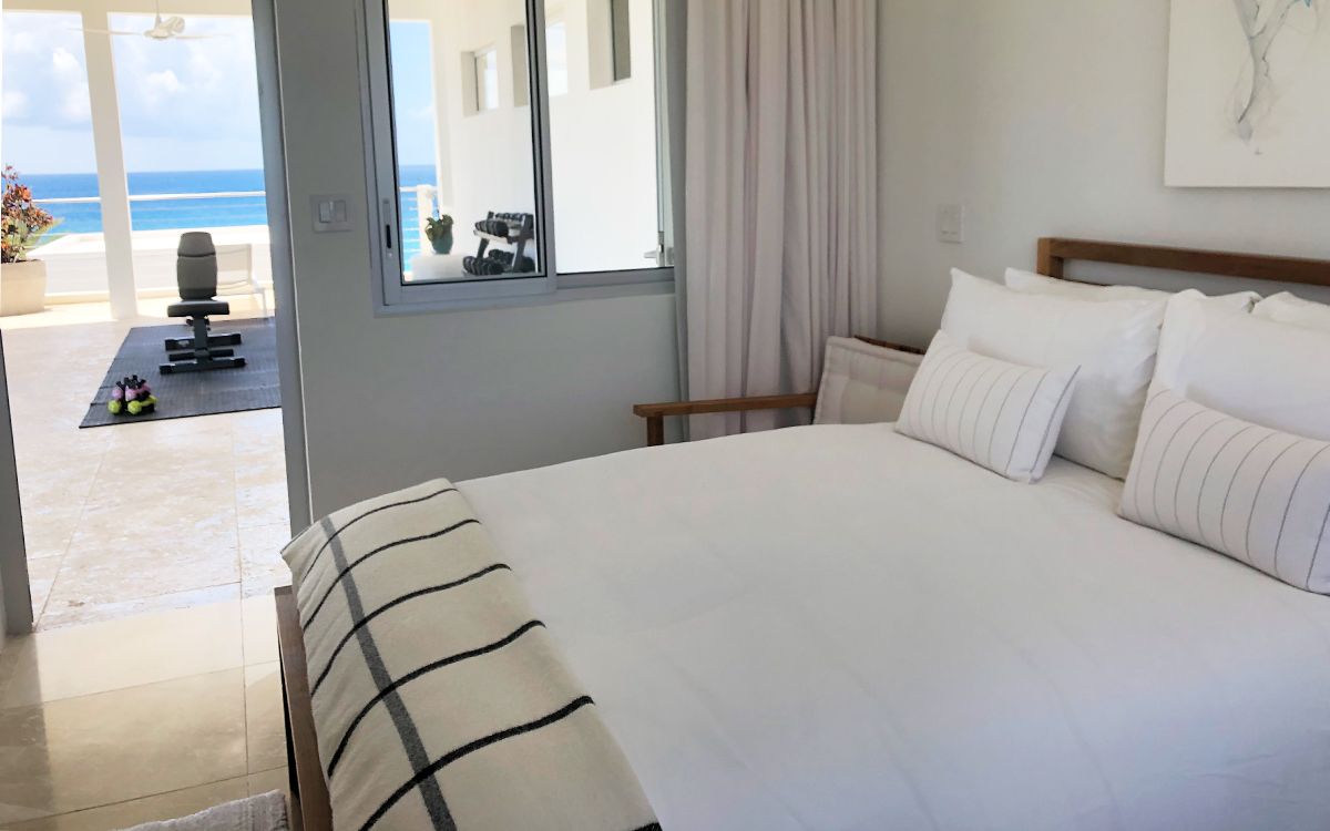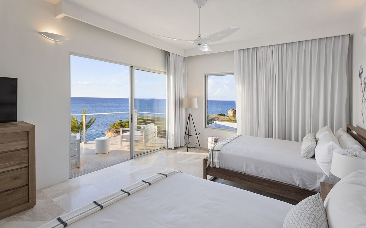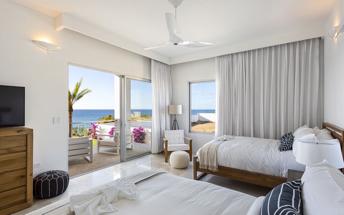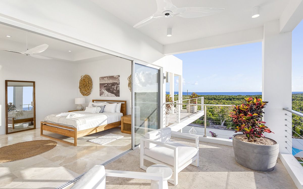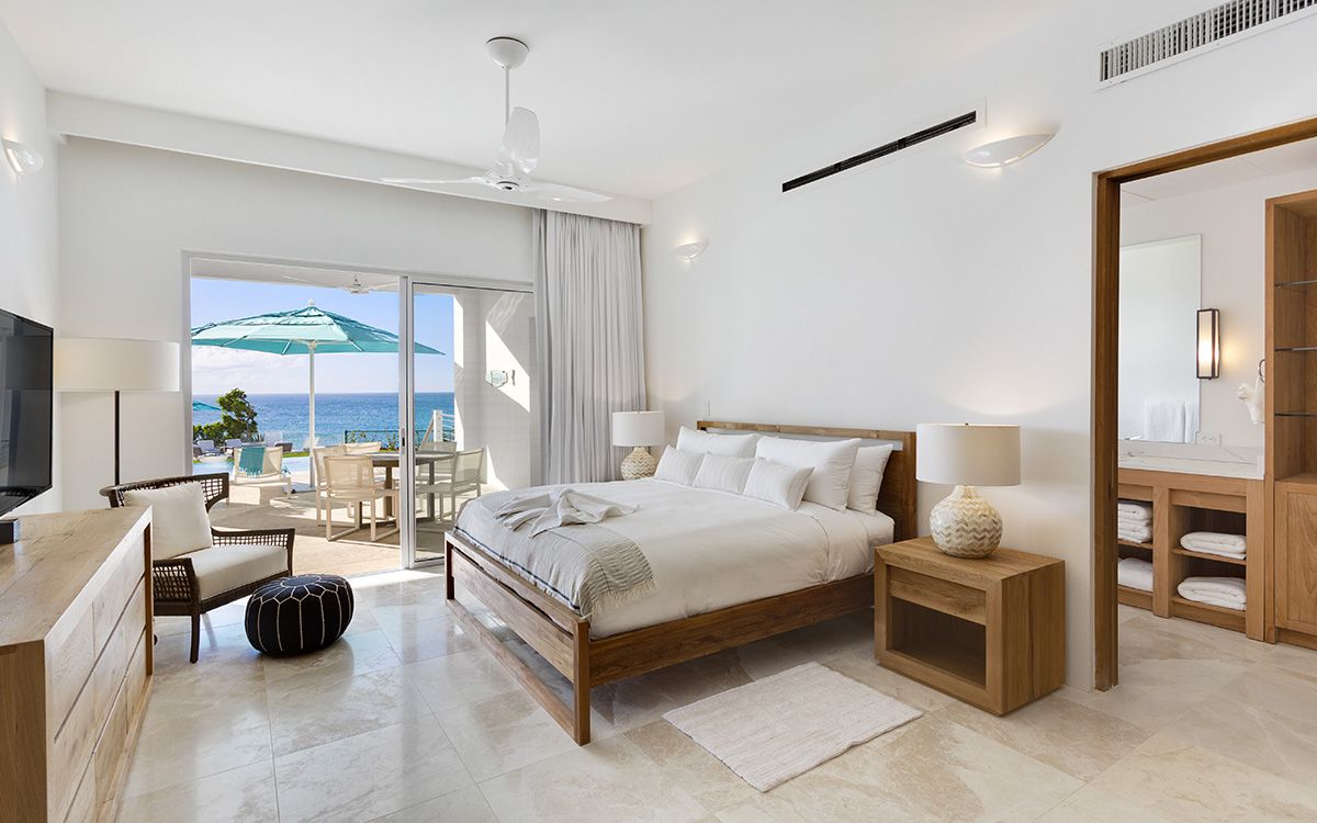 Upper level: En-suite bathroom with shower, air conditioning, ceiling fan, television, access to furnished terrace with ocean view.