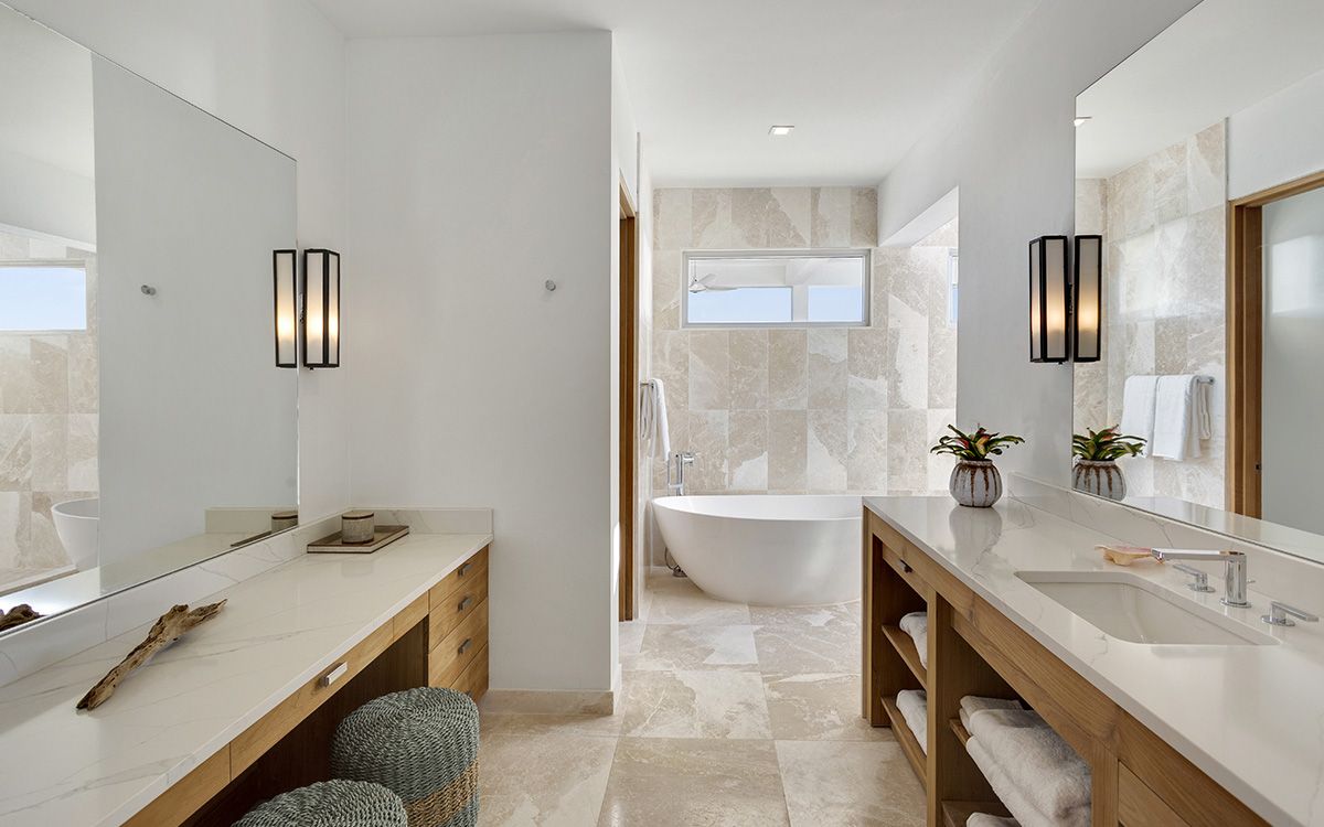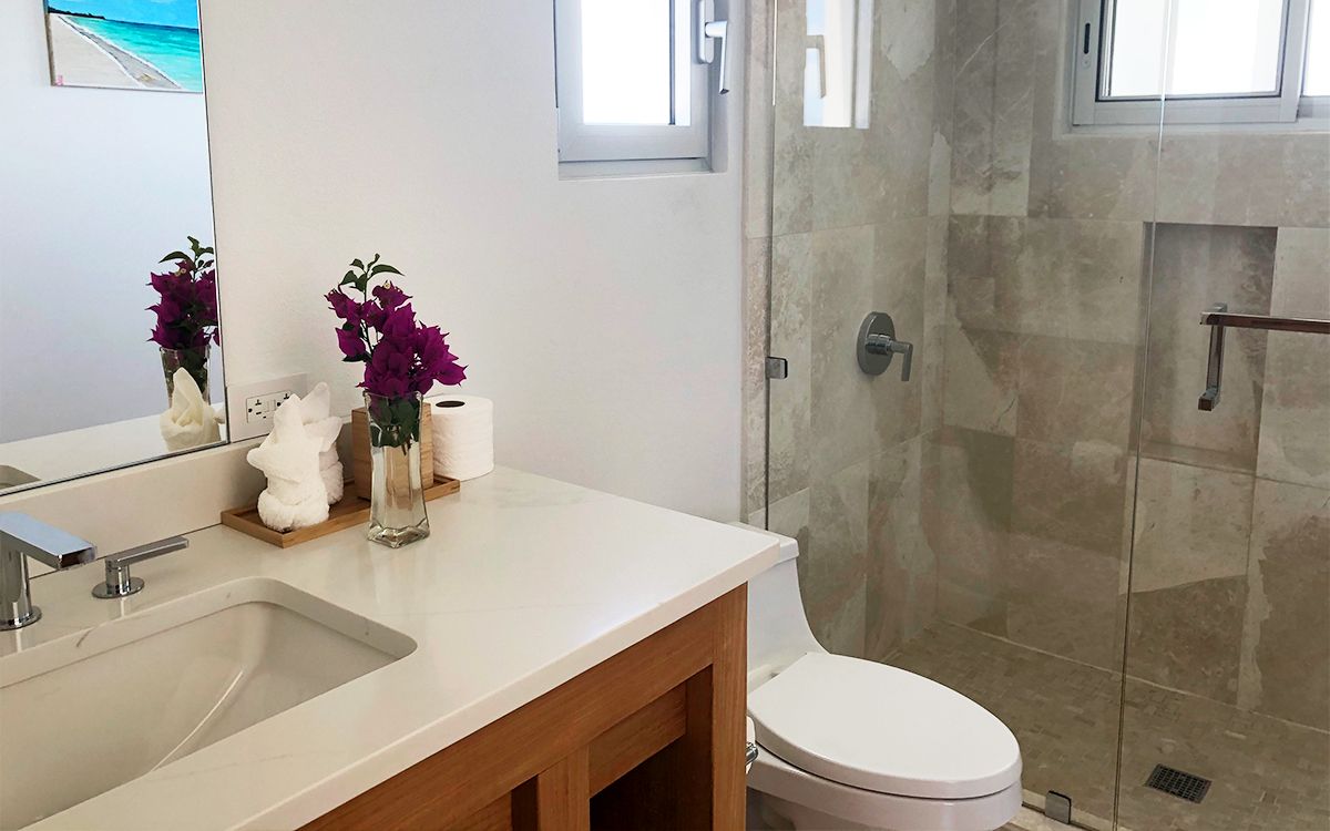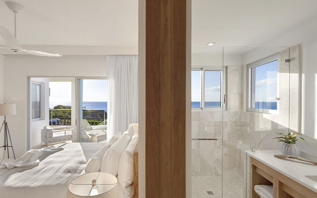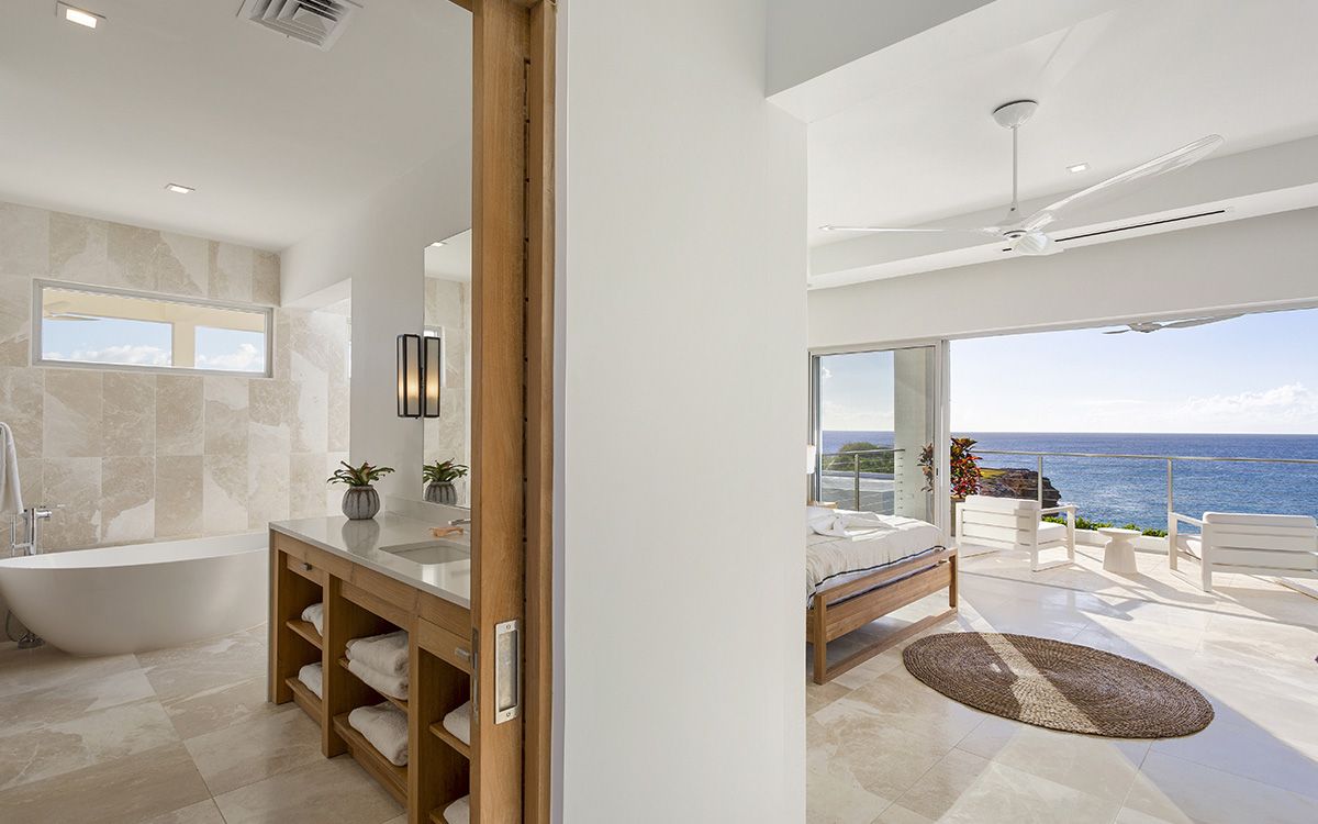 Upper level: En-suite bathroom with bathtub and shower, air conditioning, ceiling fans, access to furnished terrace with ocean view.