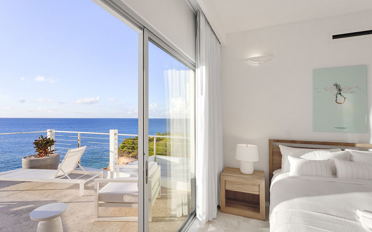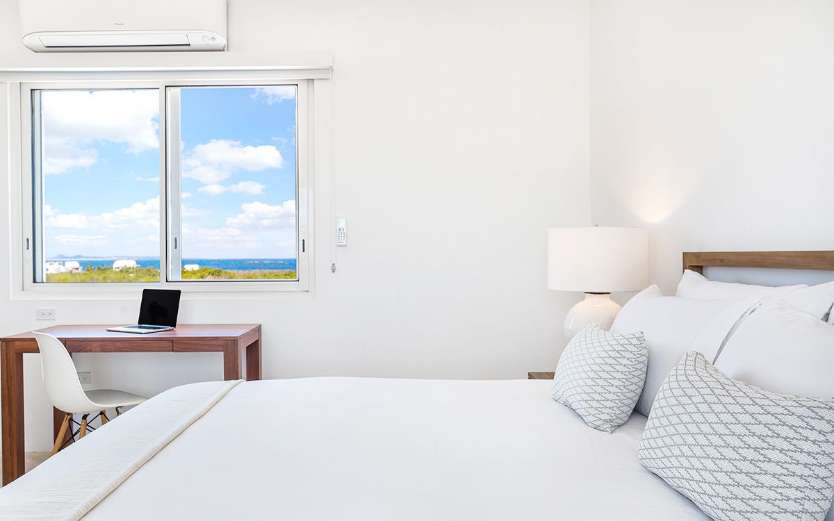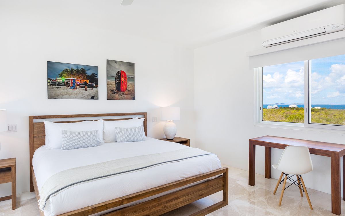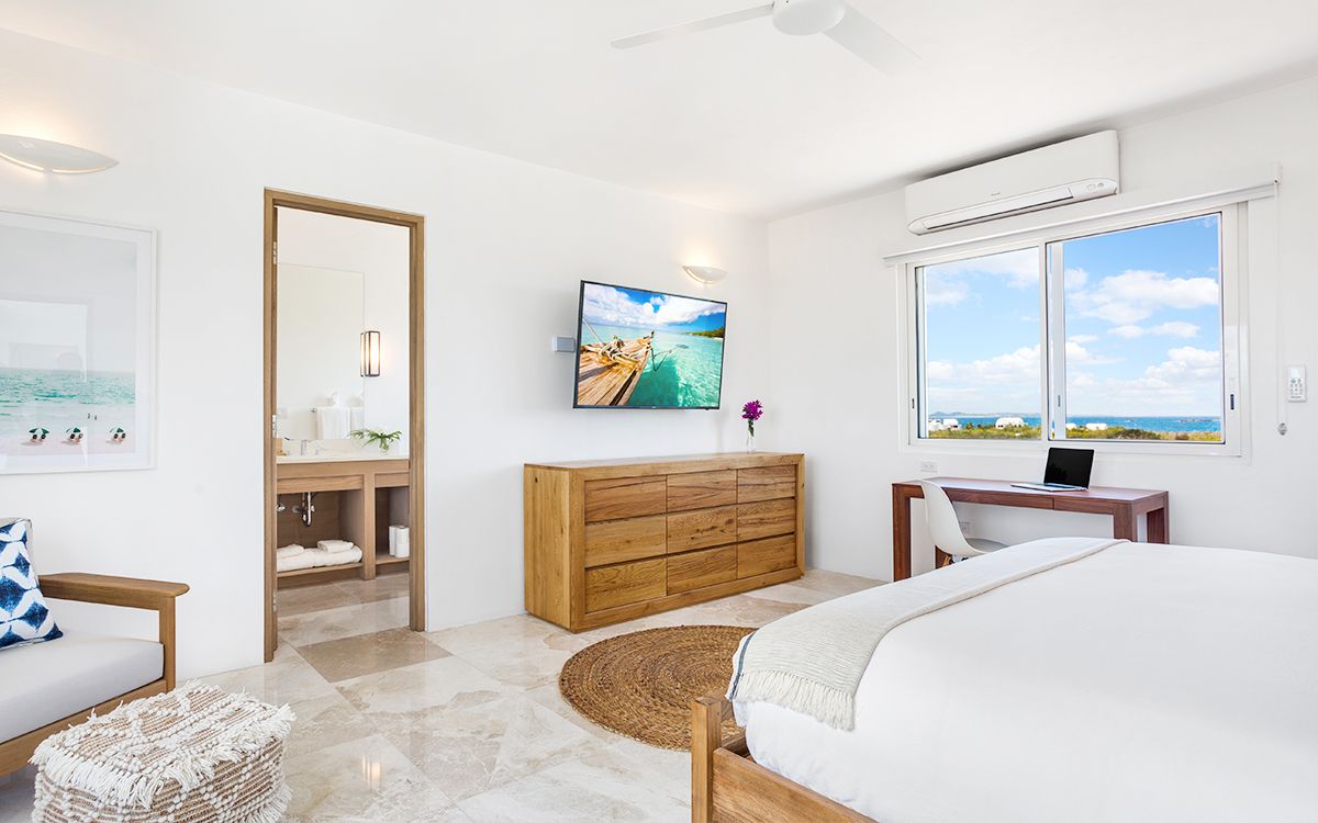 Upper level: En-suite bathroom, air conditioning, ceiling fan, television, access to furnished terrace with ocean view.