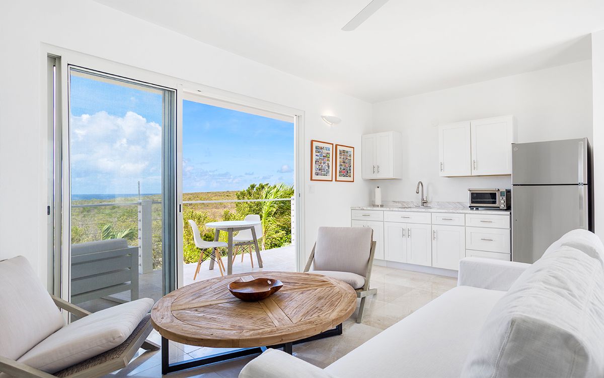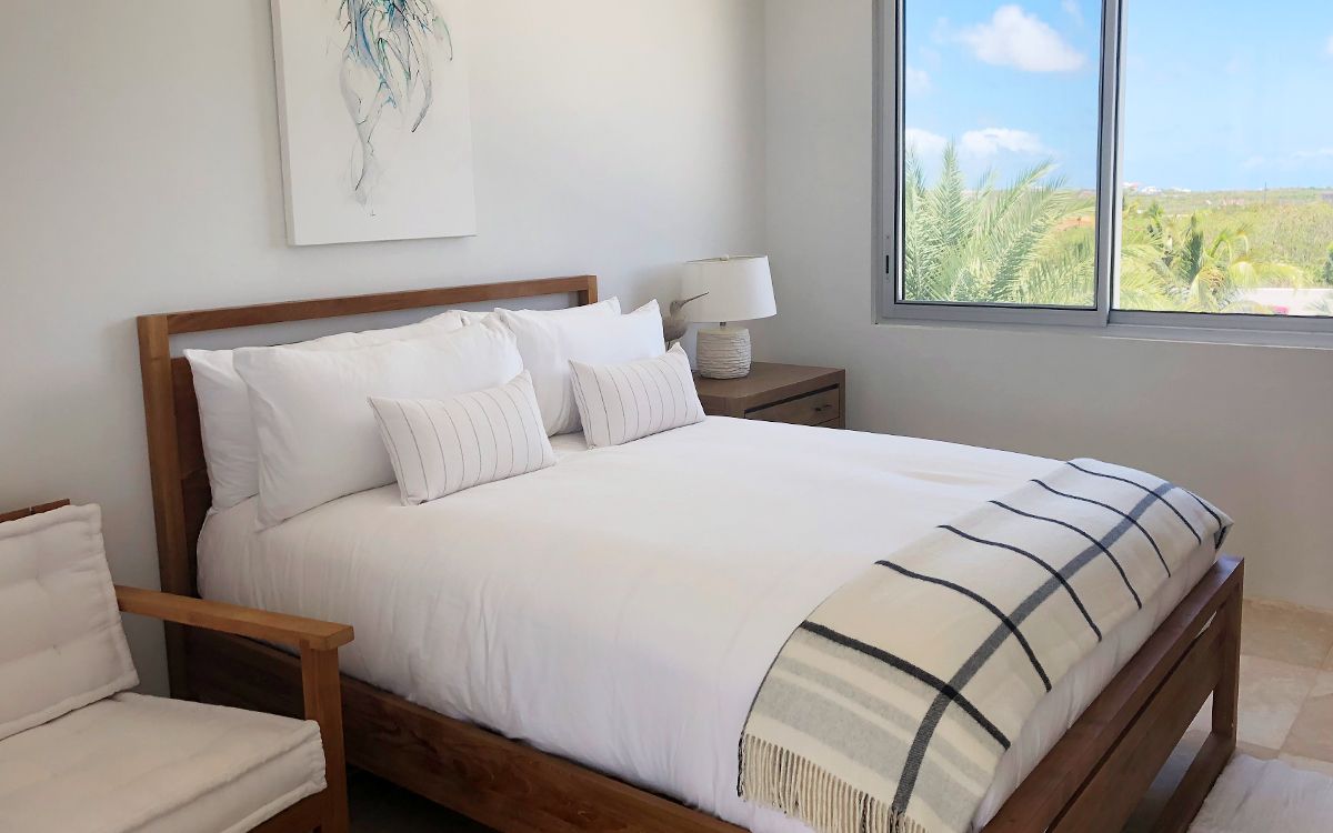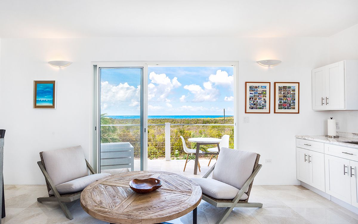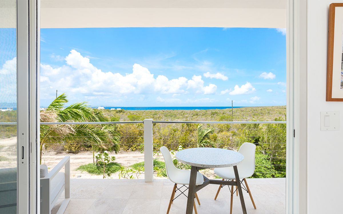 Upper level: En-suite bathroom, air conditioning, ceiling fan, television, access to furnished terrace with ocean view.