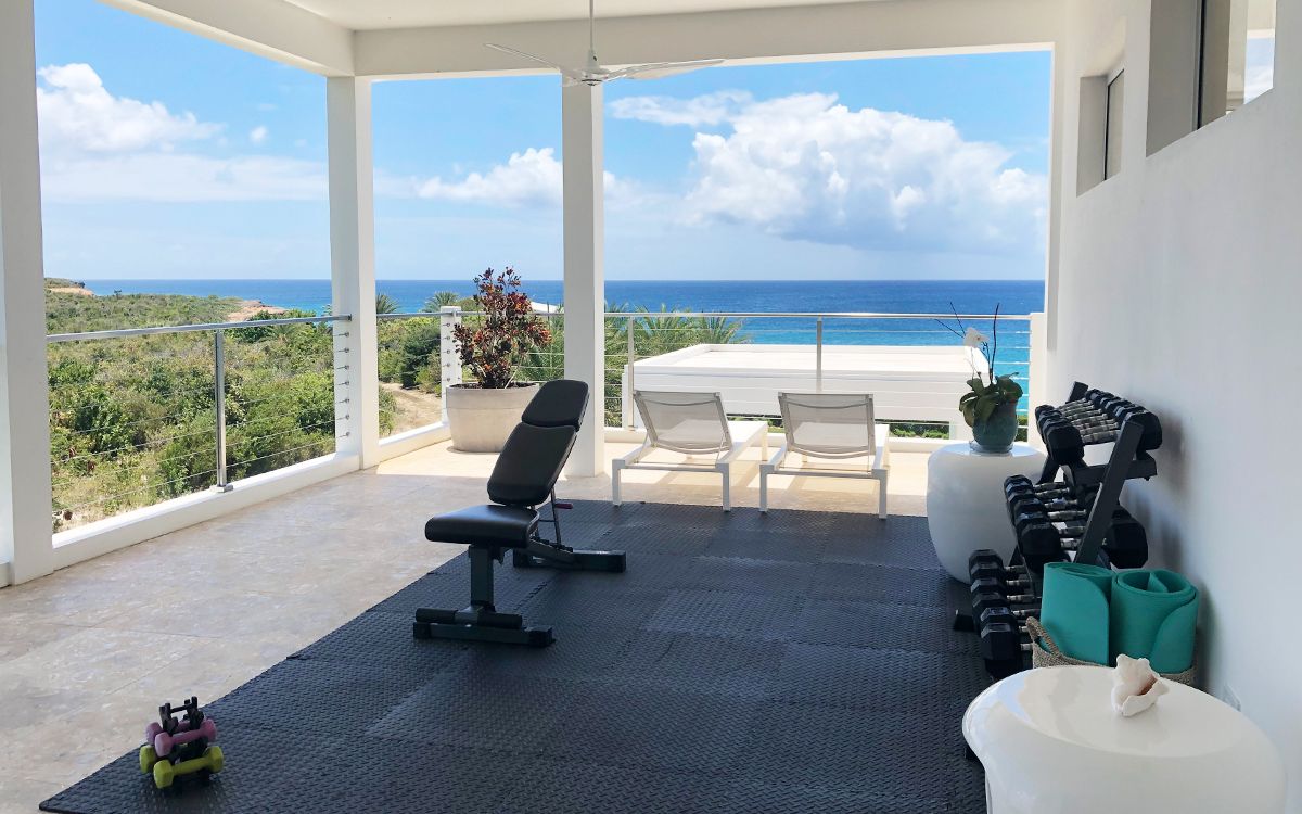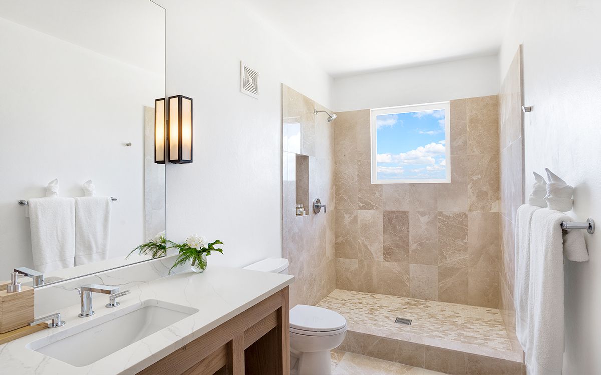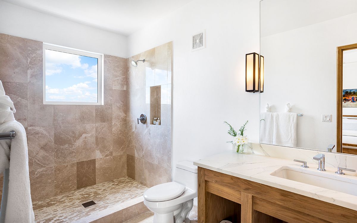 Lower level: En-suite bathroom with indoor and outdoor shower, air conditioning, ceiling fan television, access to furnished terrace which leading to pool features ocean view.