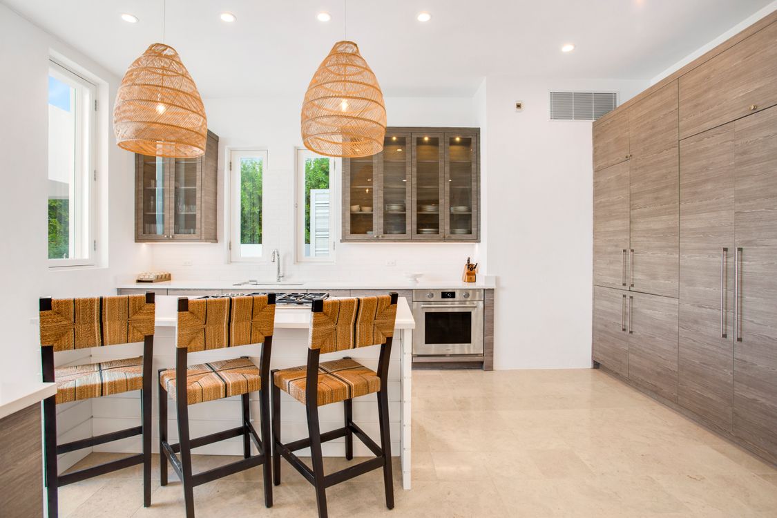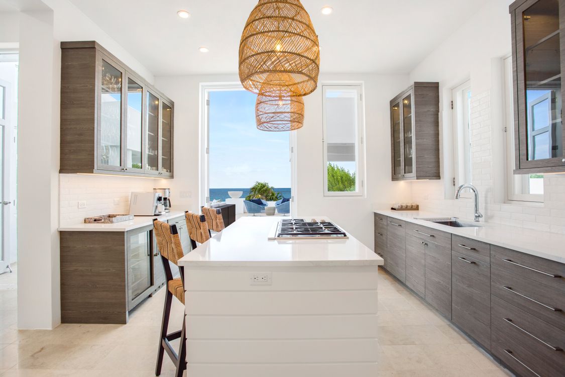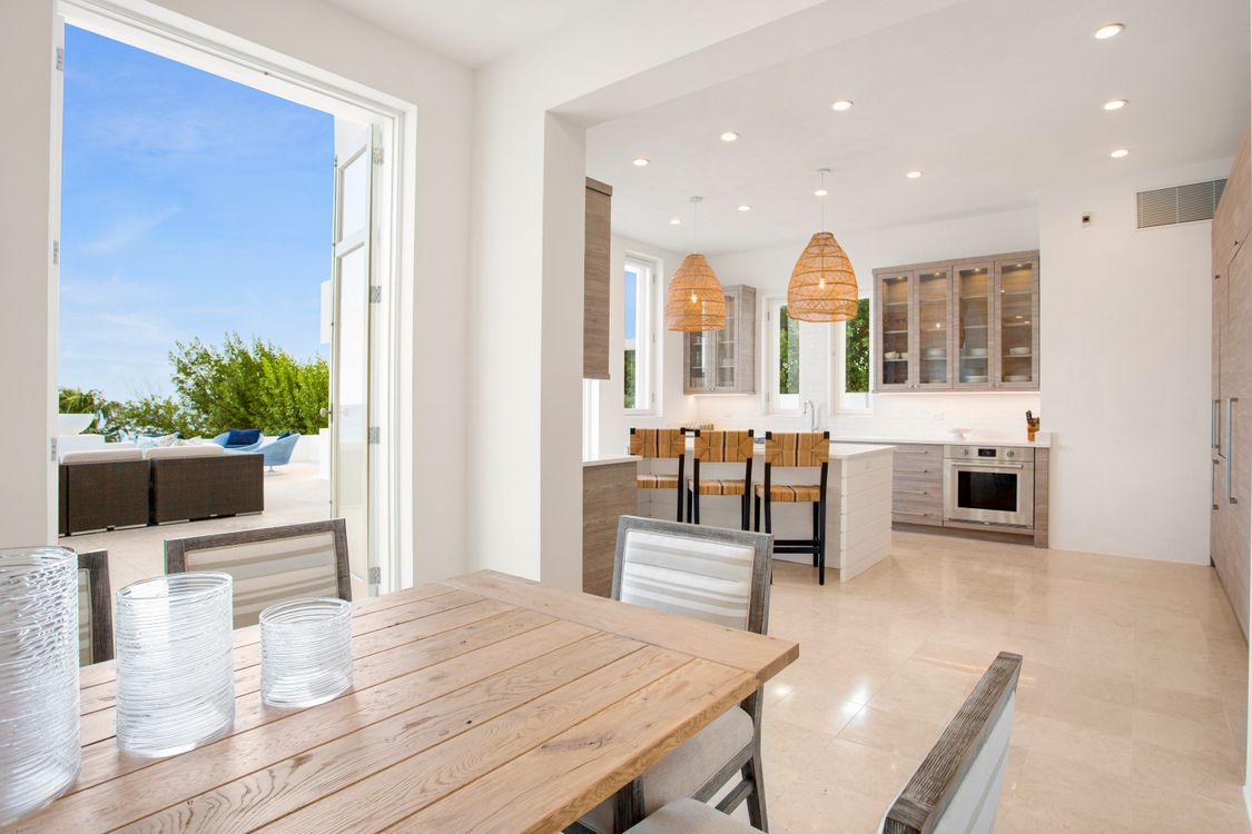 The fully equipped kitchen is a culinary dream, featuring modern appliances and ample counter space, perfect for preparing delicious meals to enjoy with family and friends. Next to the kitchen is an airy living area, where you can relax on plush sofas while gazing out at the turquoise waters of the Caribbean Sea. The formal dining area, with its elegant furnishings, offers a refined setting for sharing meals, with large doors that open onto the expansive terrace, blending indoor and outdoor living.