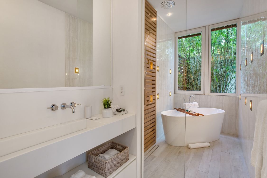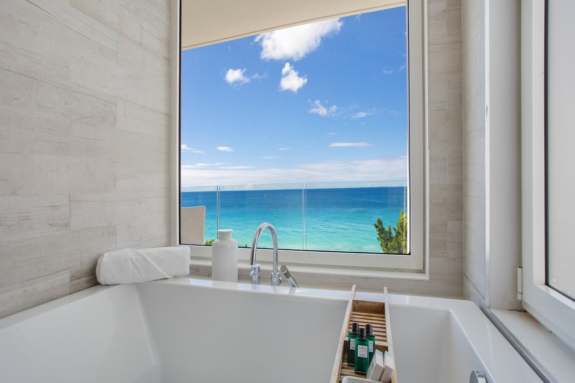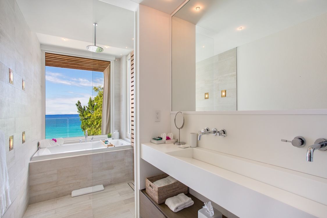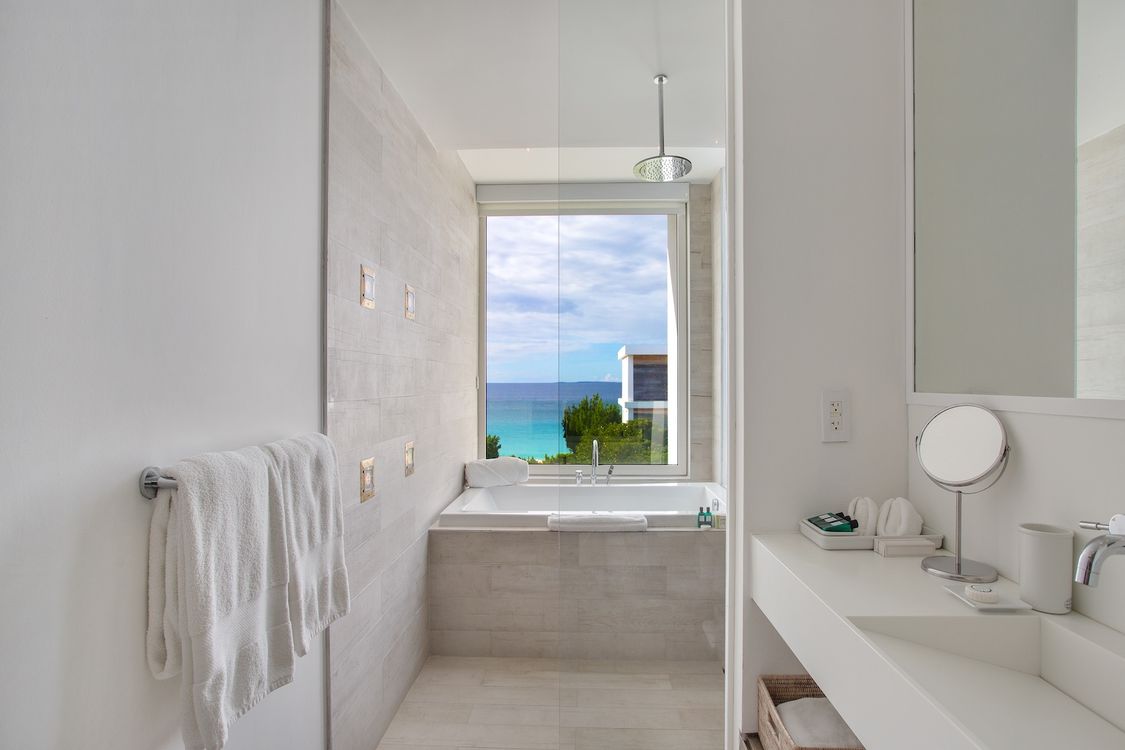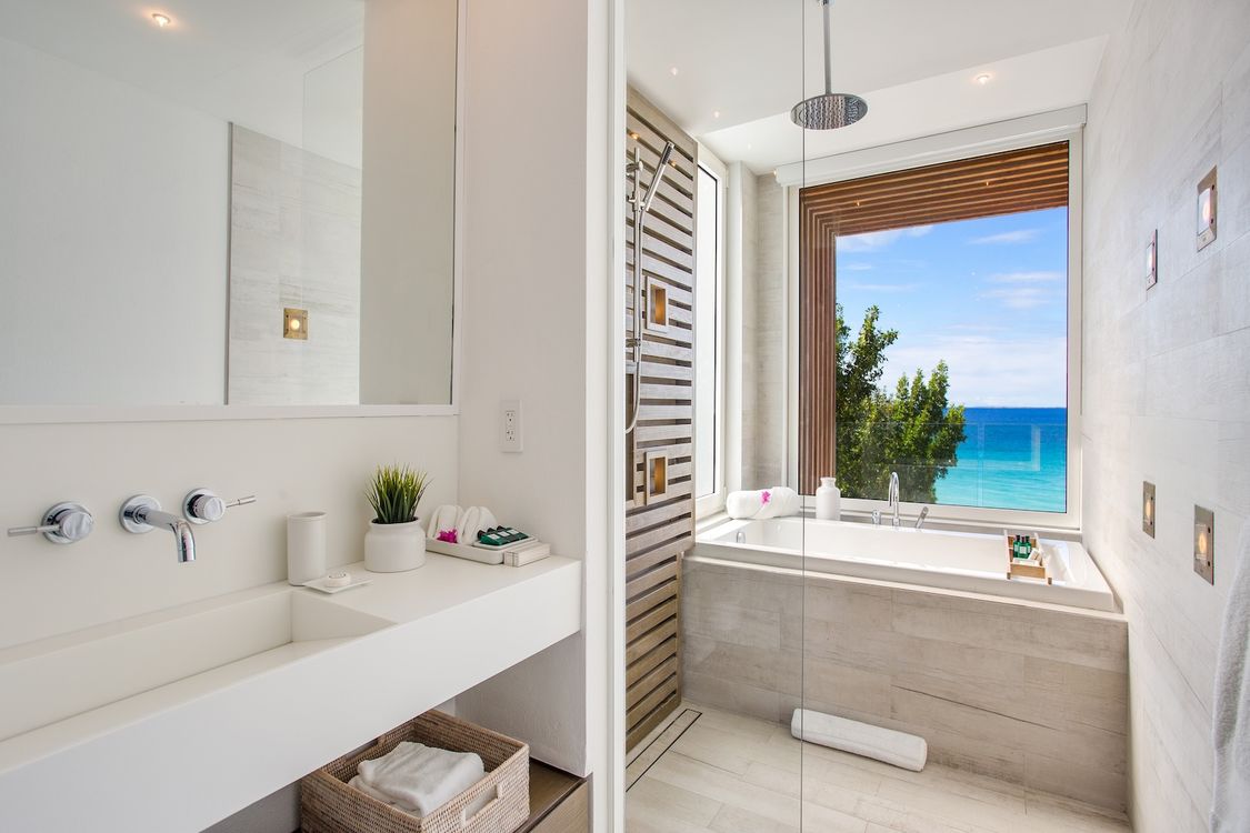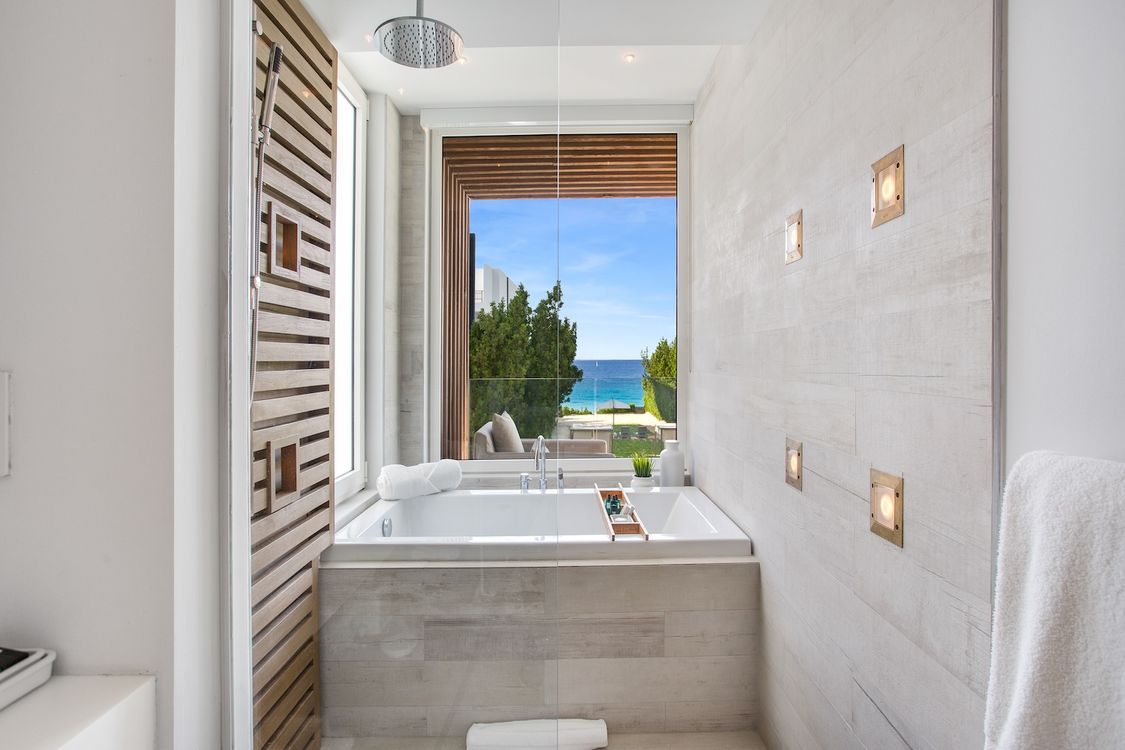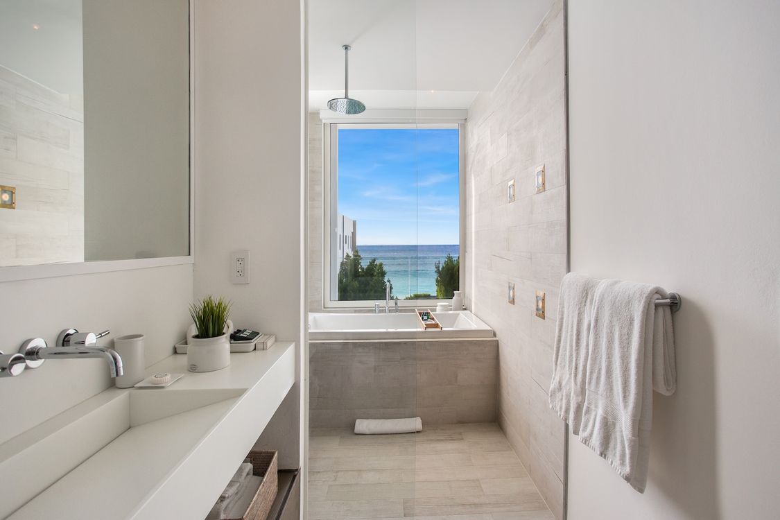 Third level: En-suite bathroom with bathtub and shower combination, air conditioning, ocean view.