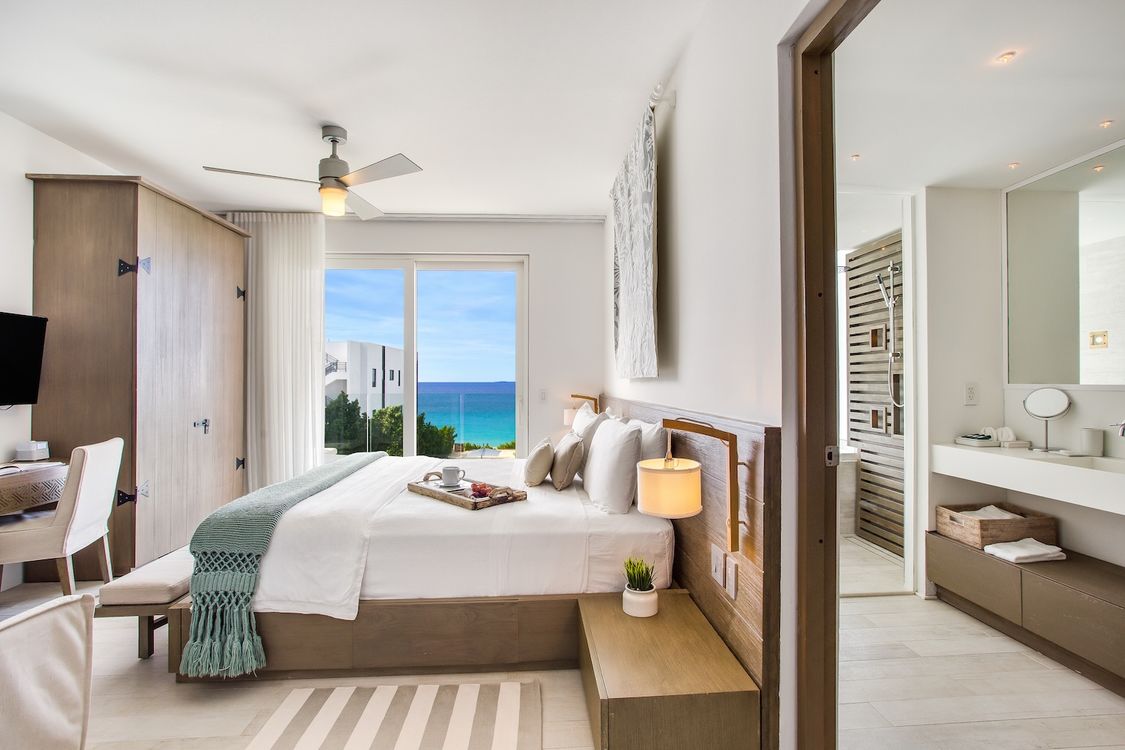Second level: En-suite bathroom with bathtub and shower combination, air conditioning, ocean view. King can be converted into two twin beds upon request.