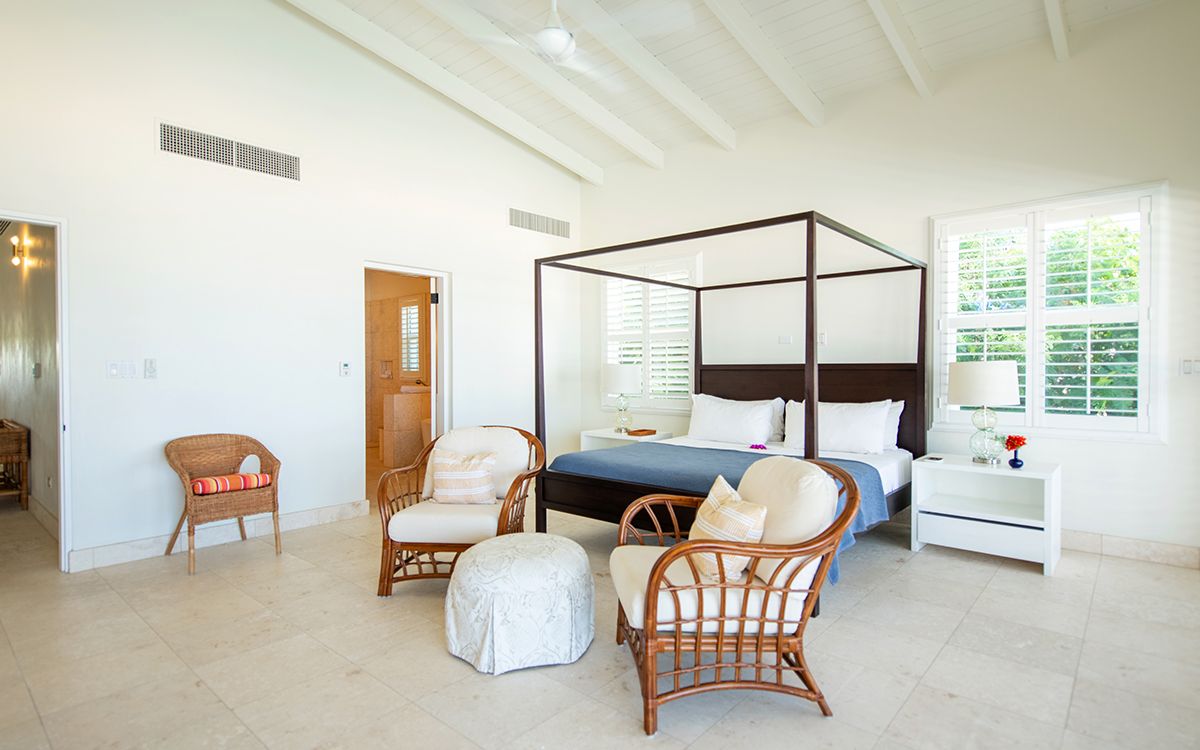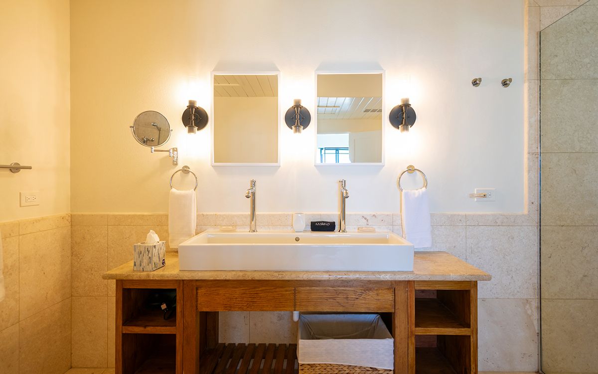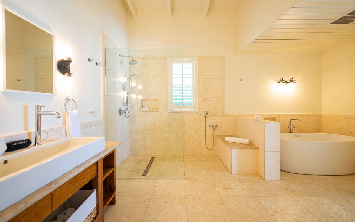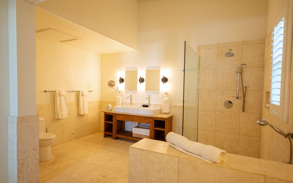 En-suite bathroom with stand-alone bathtub and walk-in shower, double vanity, air conditioning, ceiling fan, direct access to veranda with ocean view.