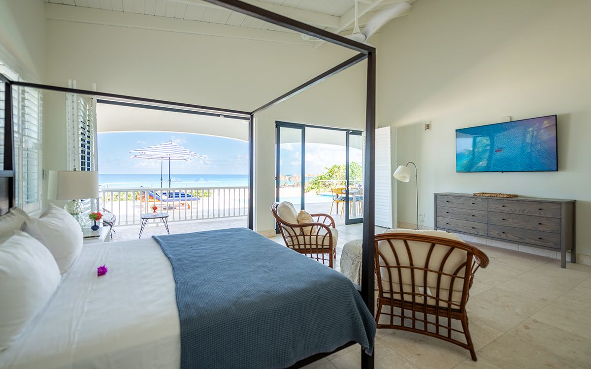 En-suite bathroom with walk-in shower, air conditioning, ceiling fan, television, direct access to furnished veranda with ocean view.