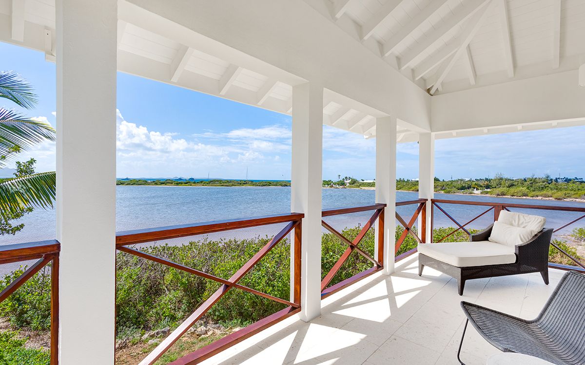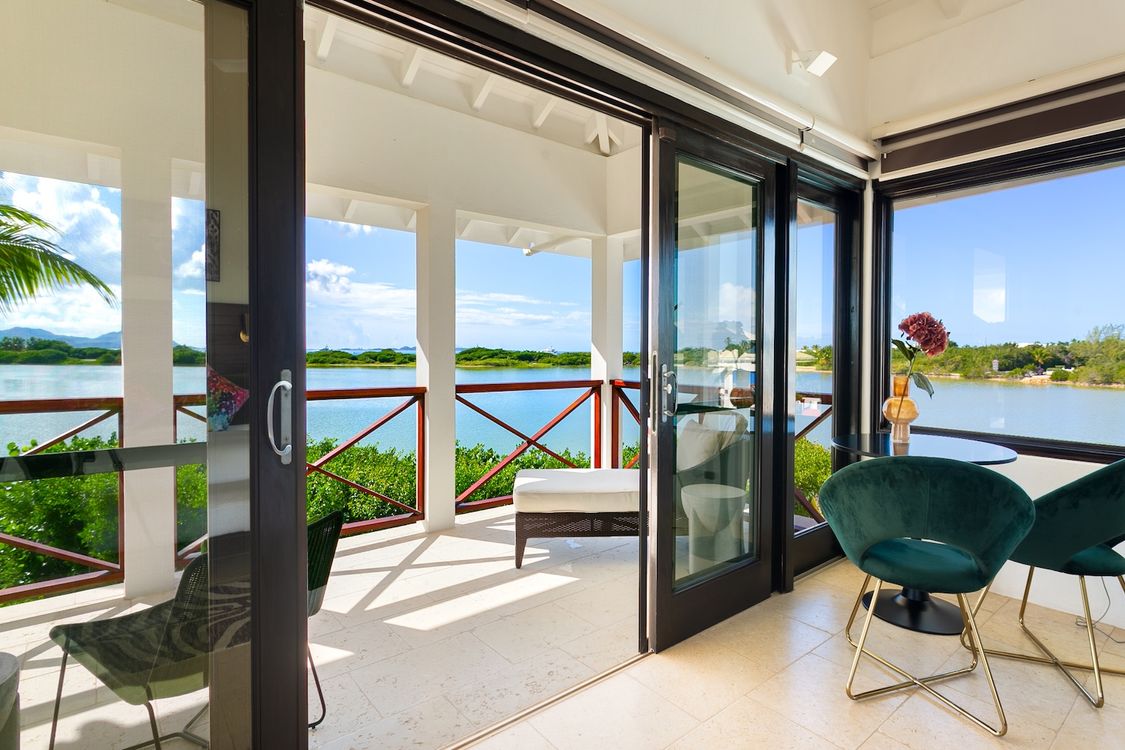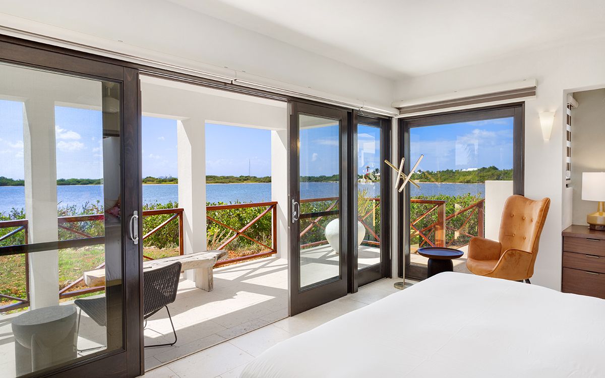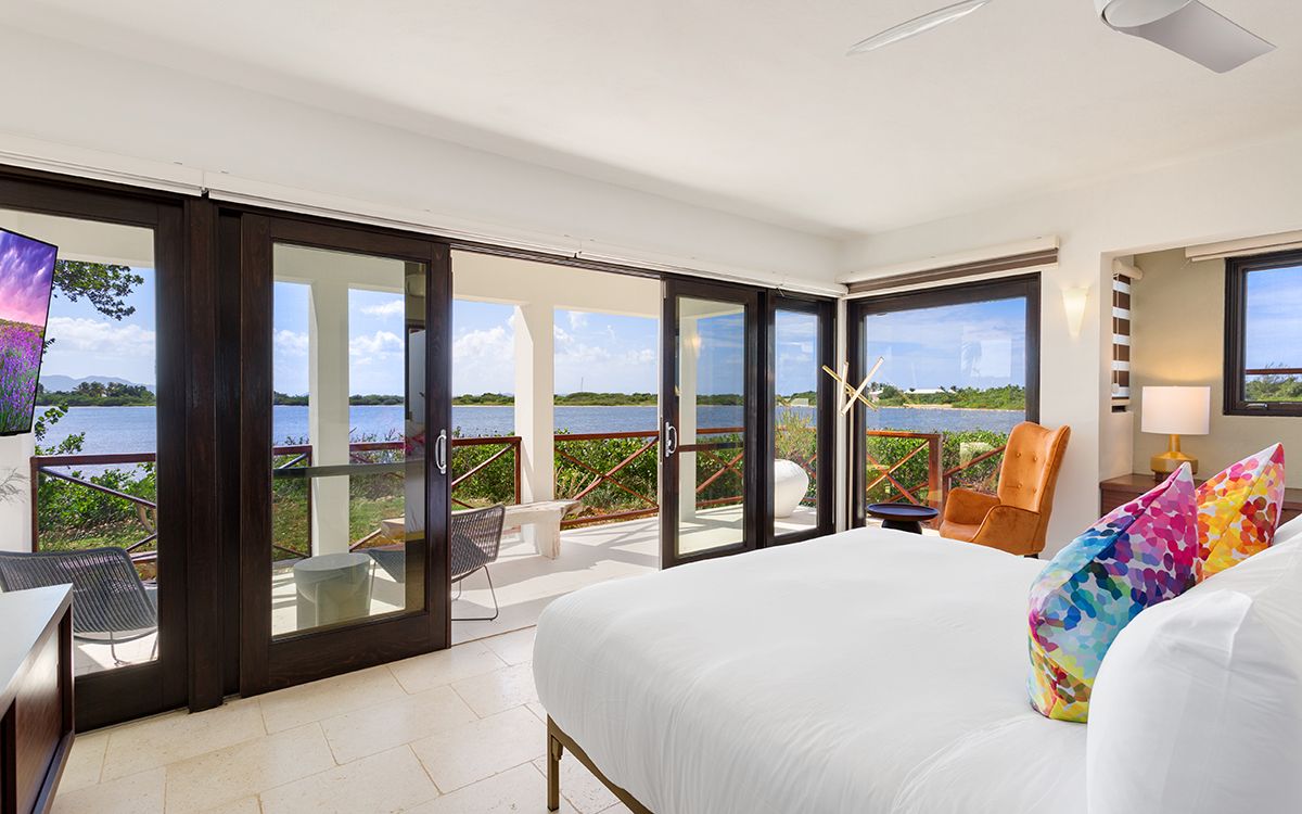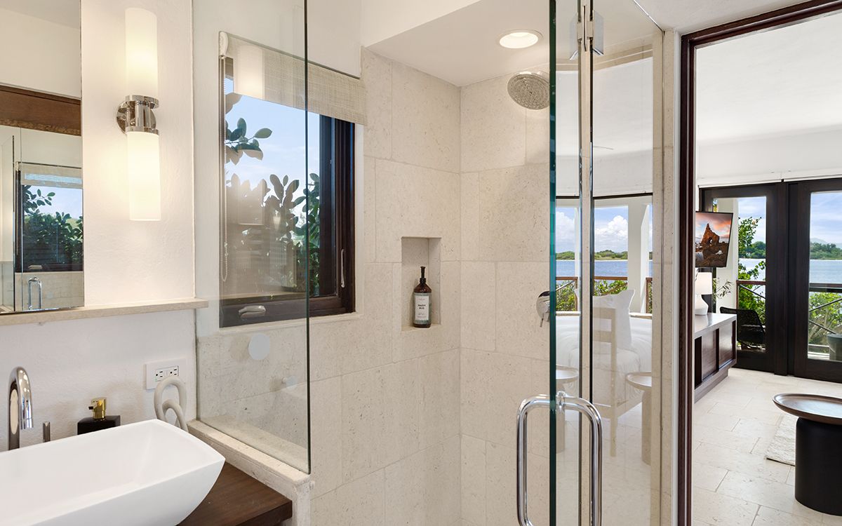 Lower level: En-suite bathroom with walk-in shower, air conditioning, ceiling fan, television, desk, furnished private veranda with bay view.