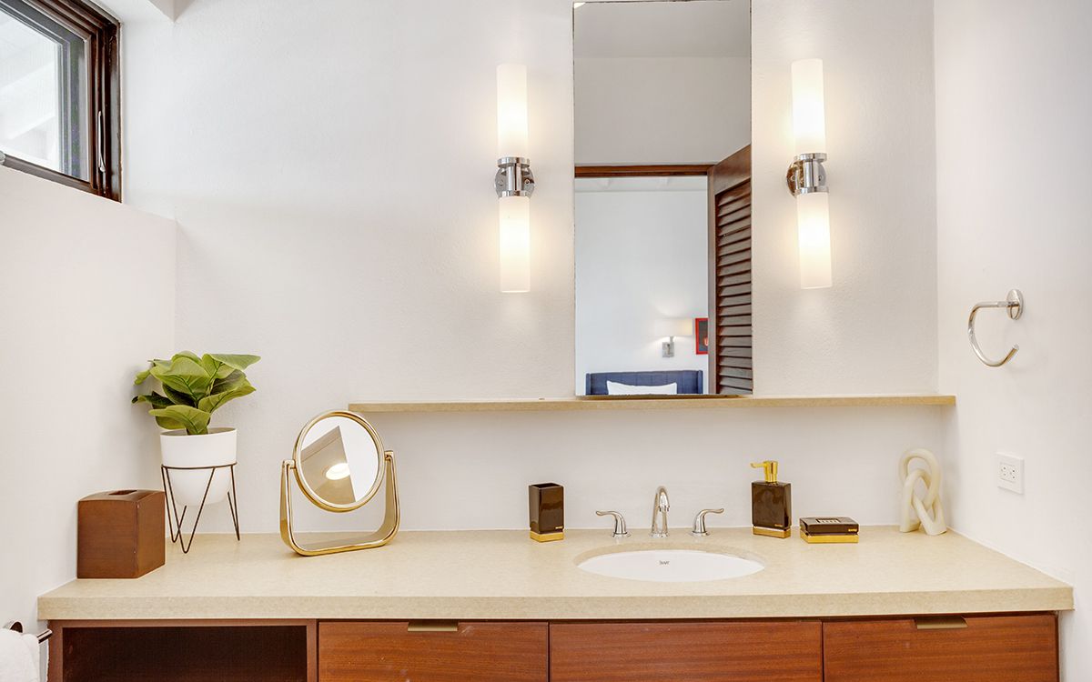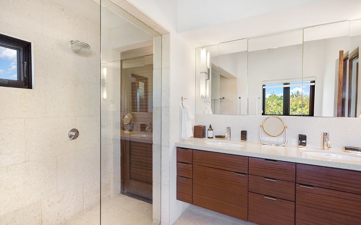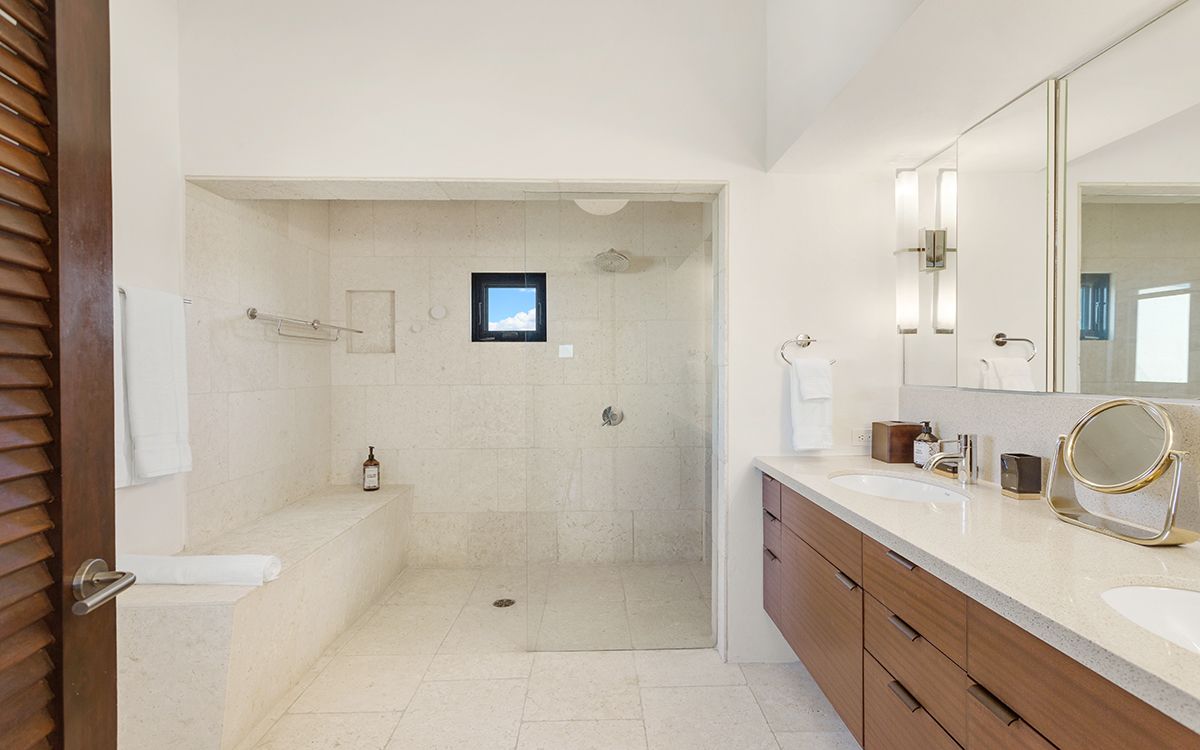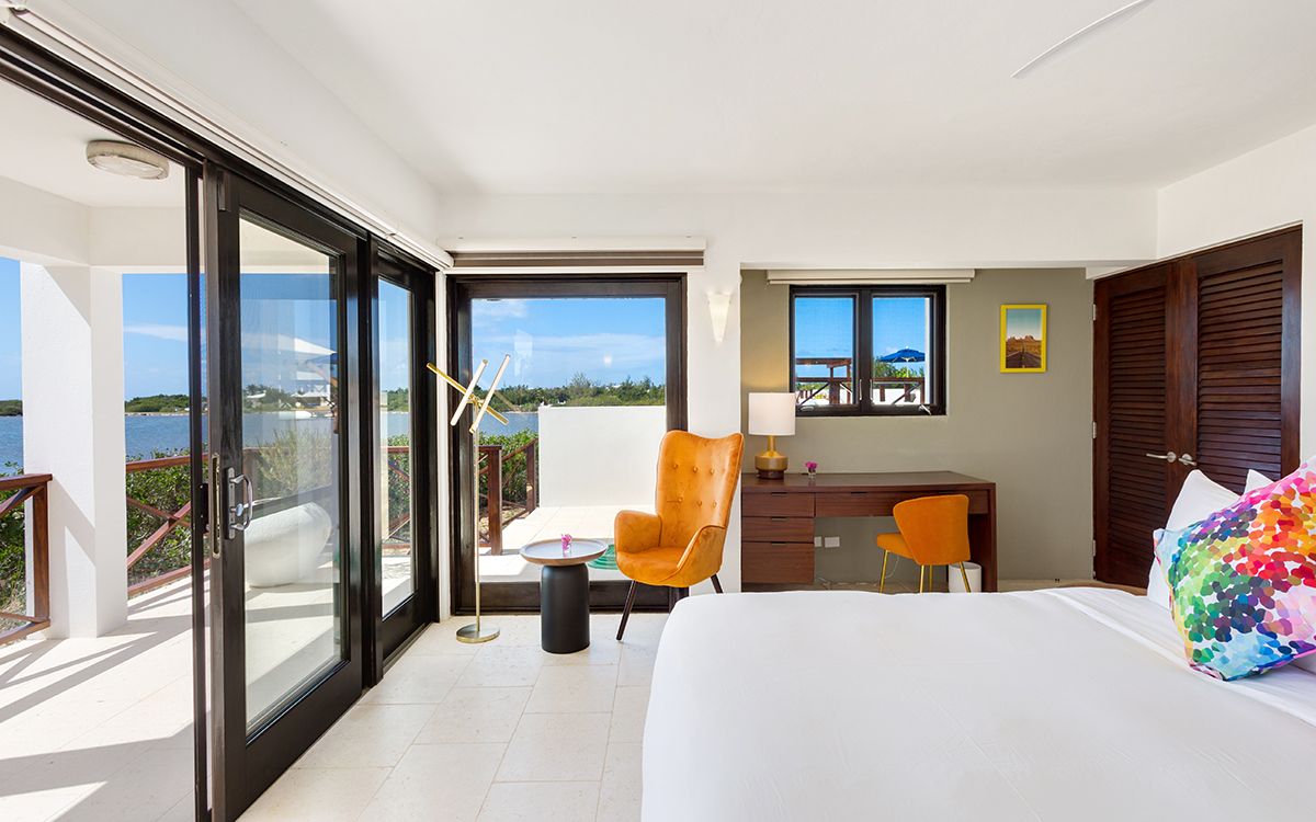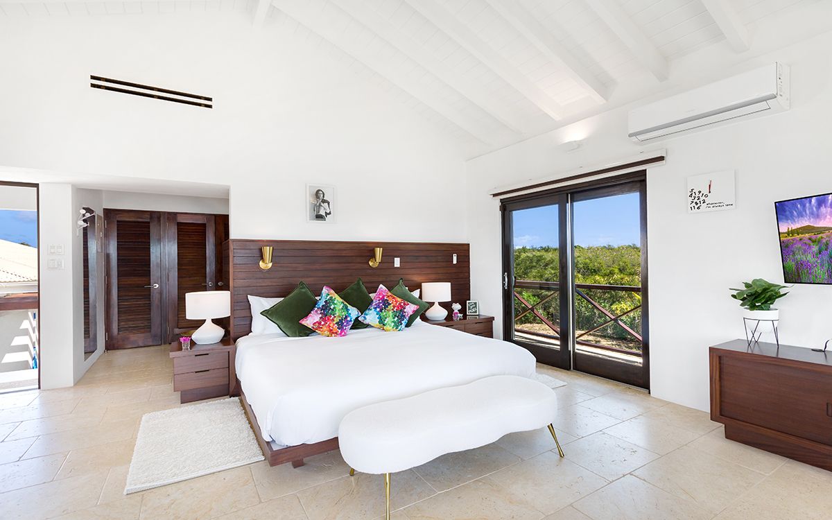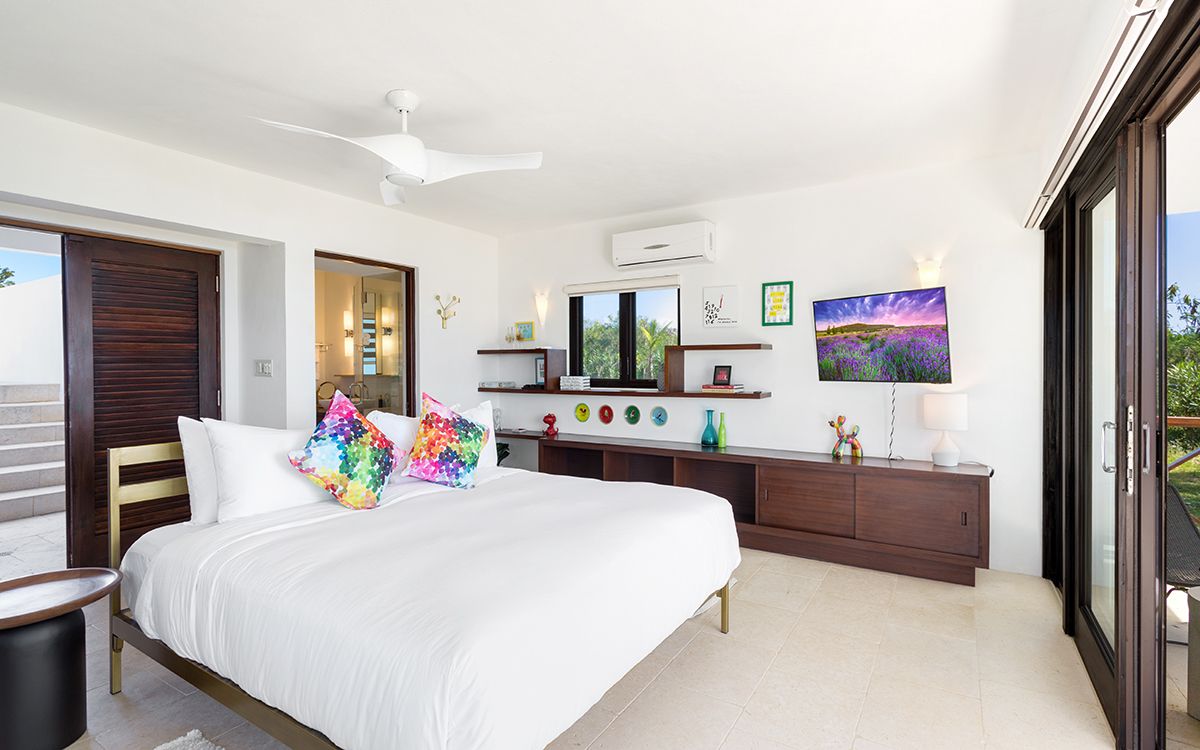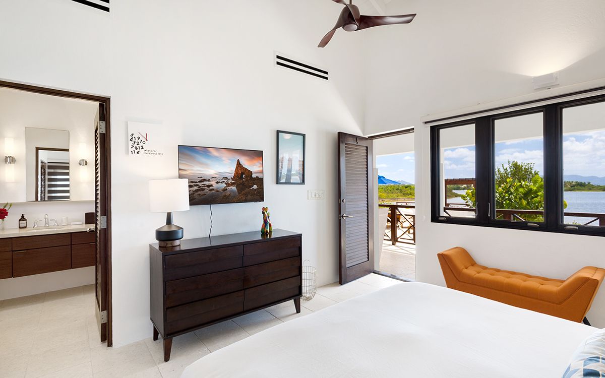 Upper level: En-suite bathroom with walk-in shower, double vanity, air conditioning, ceiling fan, television, seating area, furnished private balcony with bay view.
