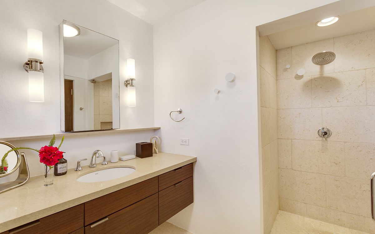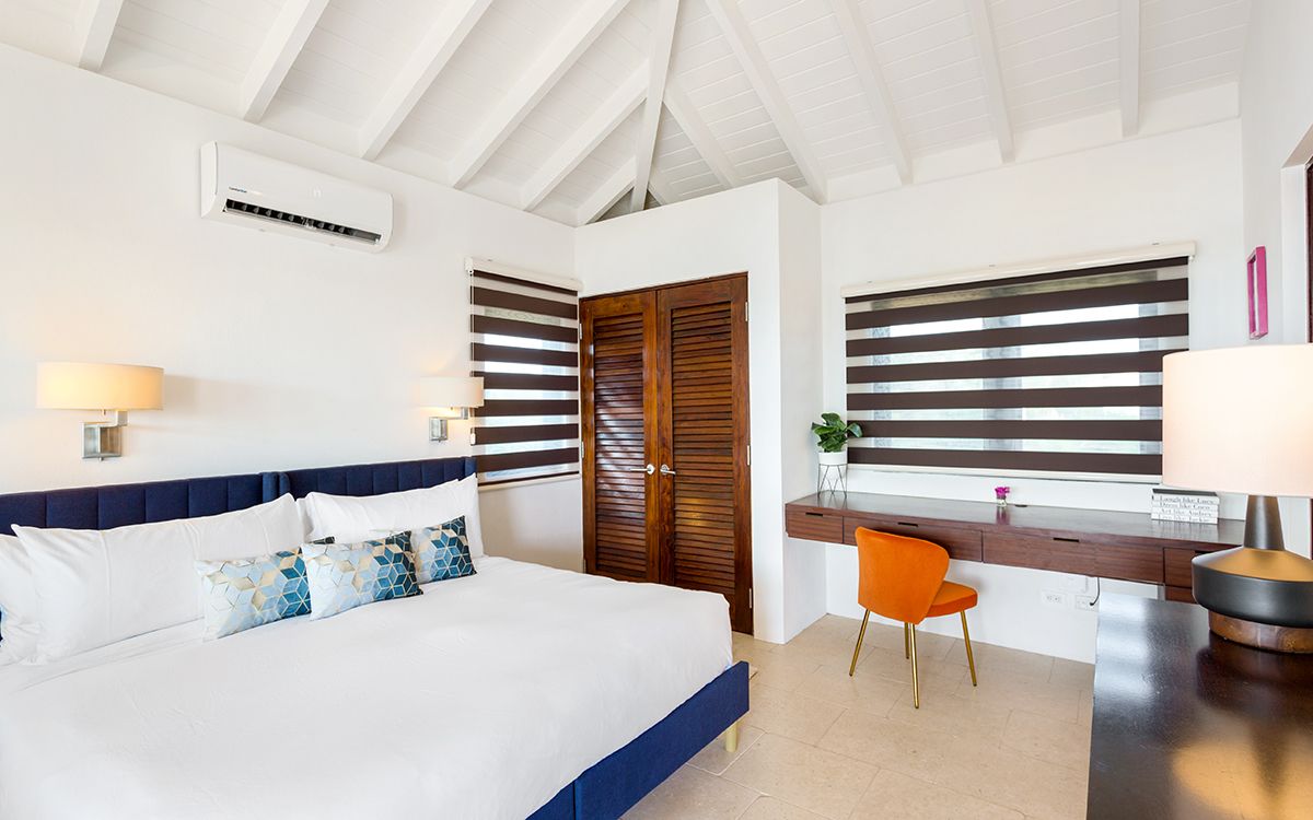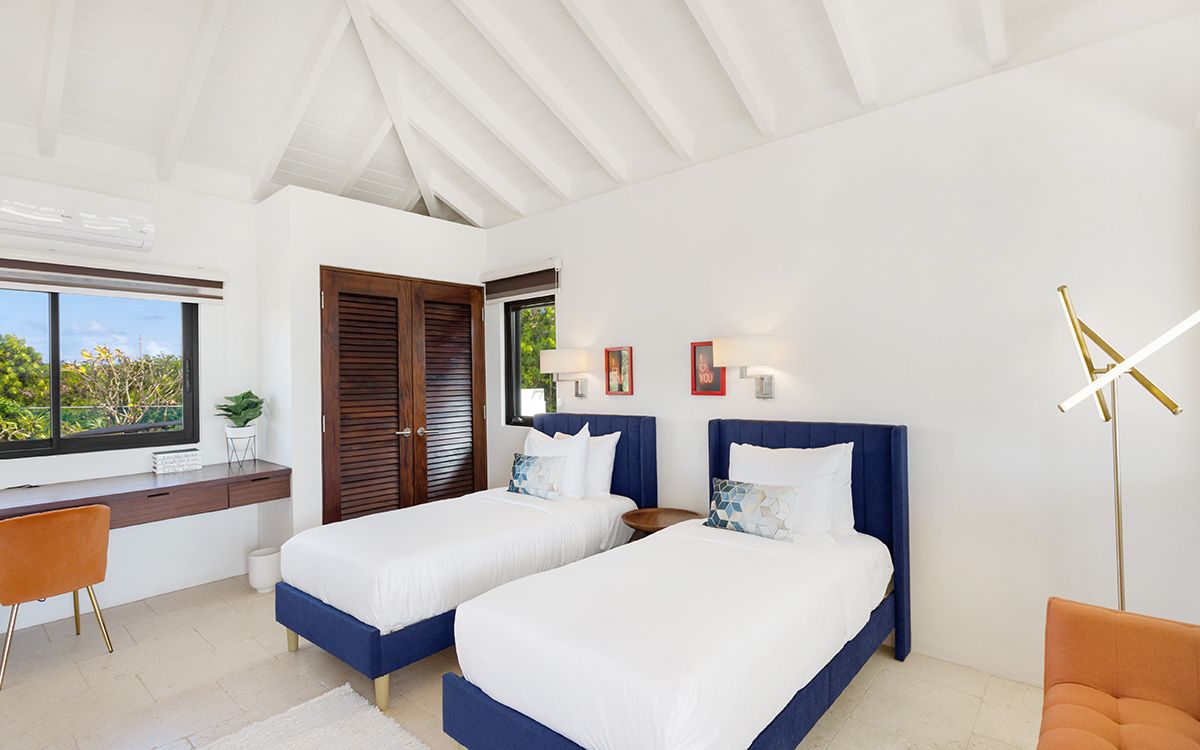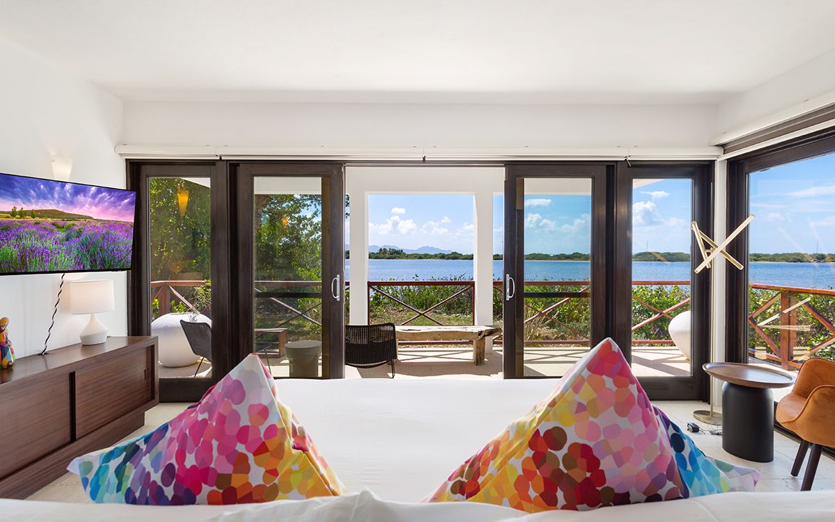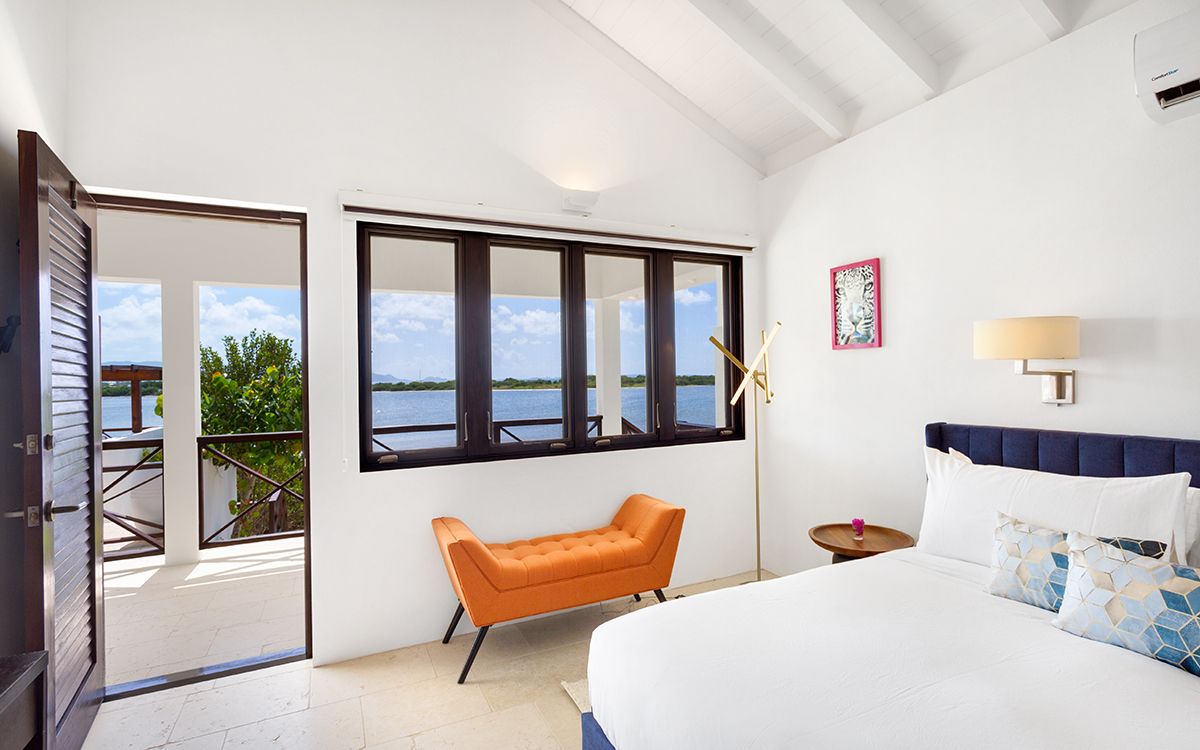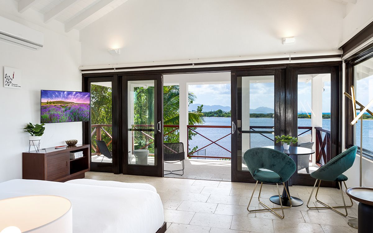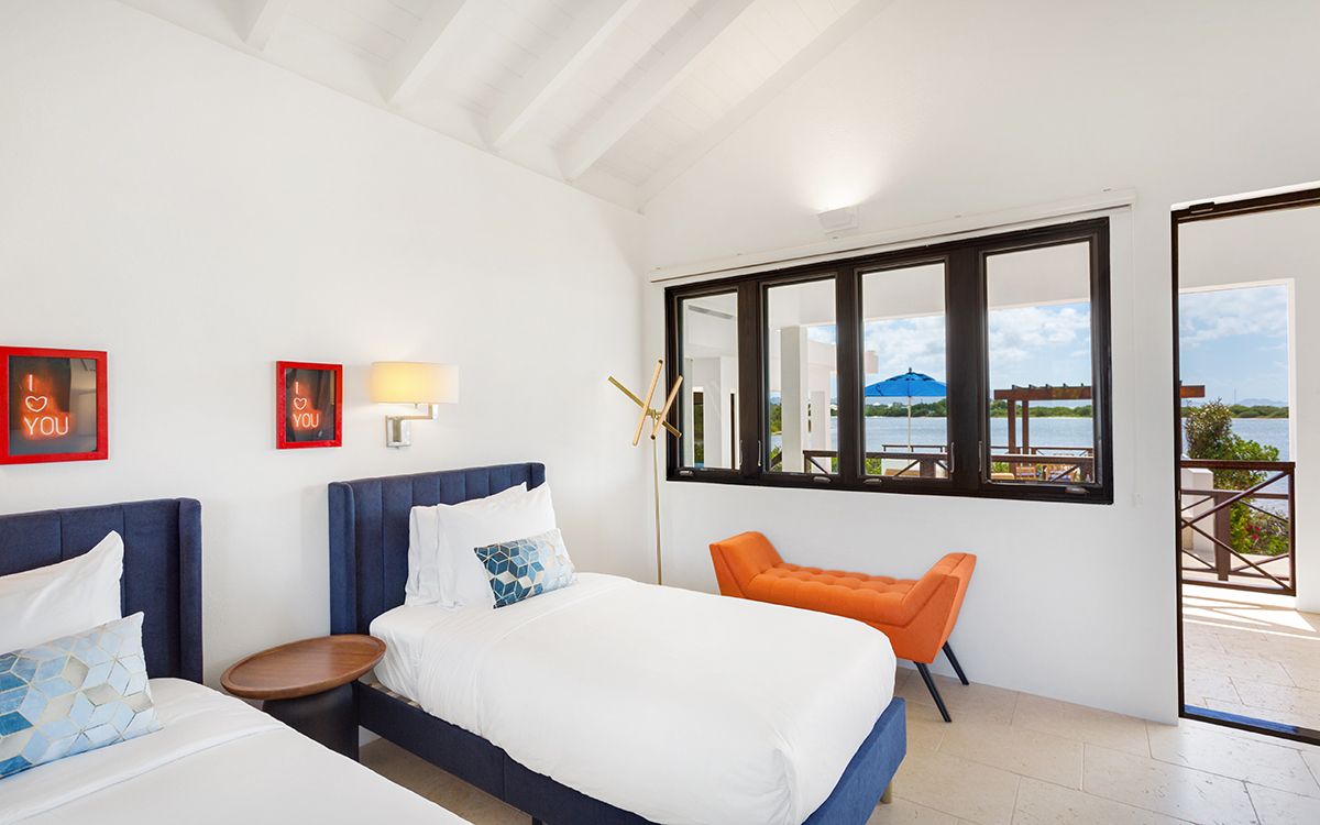 Lower level: En-suite bathroom with walk-in shower, air conditioning, ceiling fan, television, chaise lounge, desk, access to veranda with bay view. Twin beds can be converted to a king bed upon request.