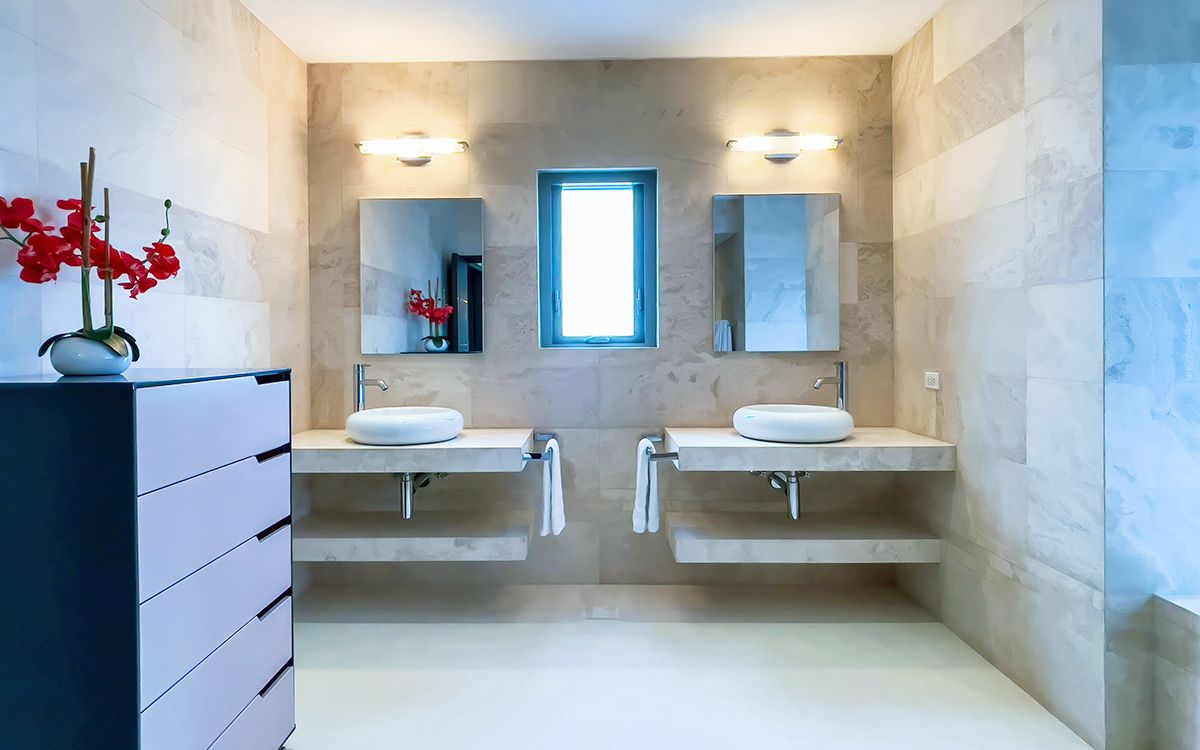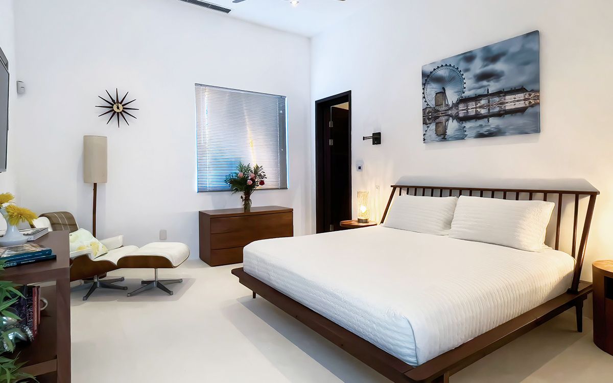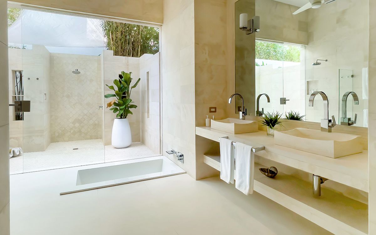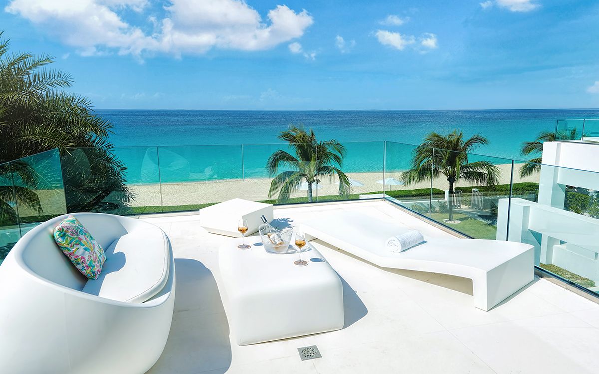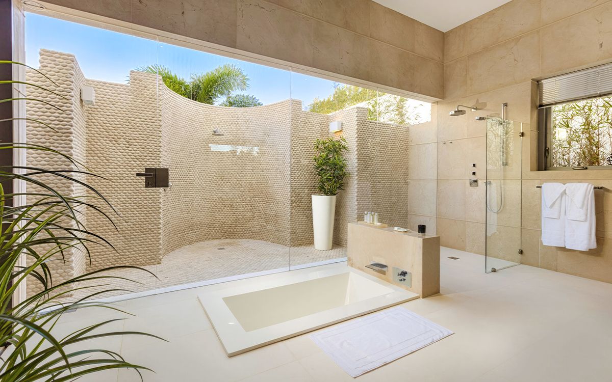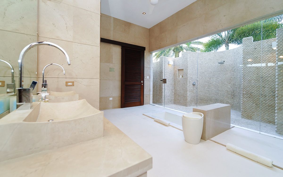 Built on one acre and comprising over 10,000 square feet of interior and 5,000 square feet of exterior terrace the Beach House accommodation consists of 8 master bedrooms and 10 bathrooms and features extensive and spacious open plan living areas. Take a look at the photos and the view from the bath tub!