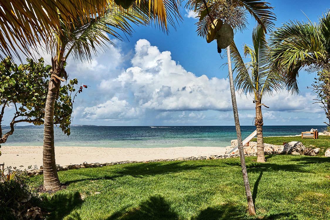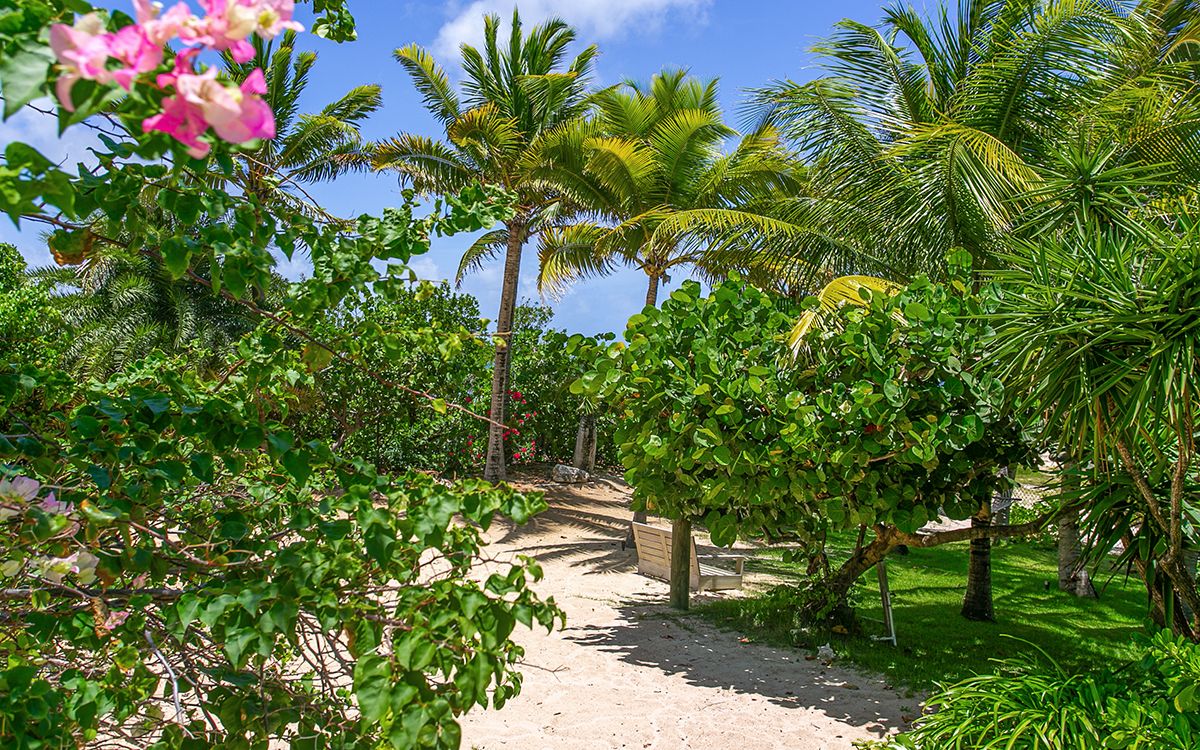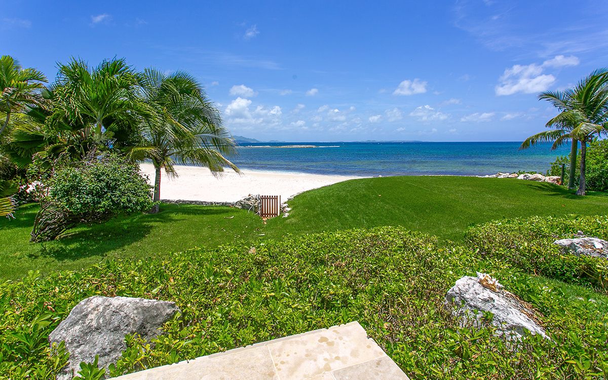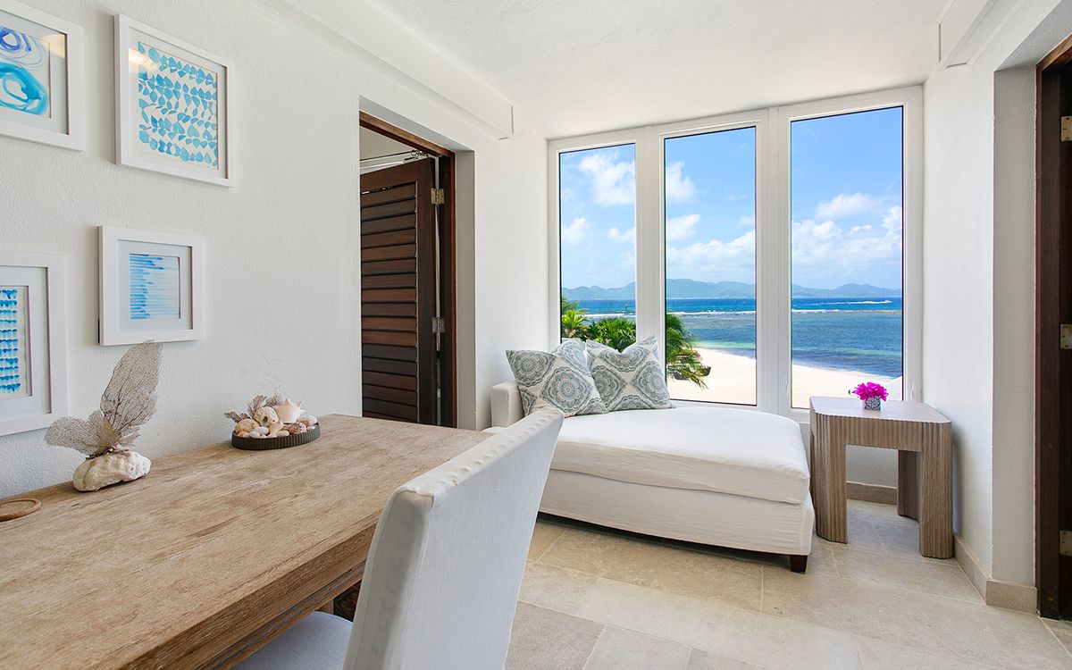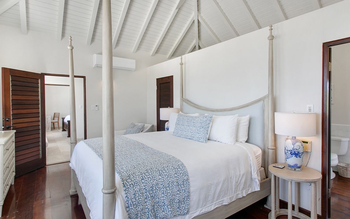 Lower level: En-suite bathroom with walk-in rain shower, air conditioning, ceiling fan, television, sitting area, desk, opens onto a furnished patio with the views of Caribbean sea. Interconnects with bedroom 5.