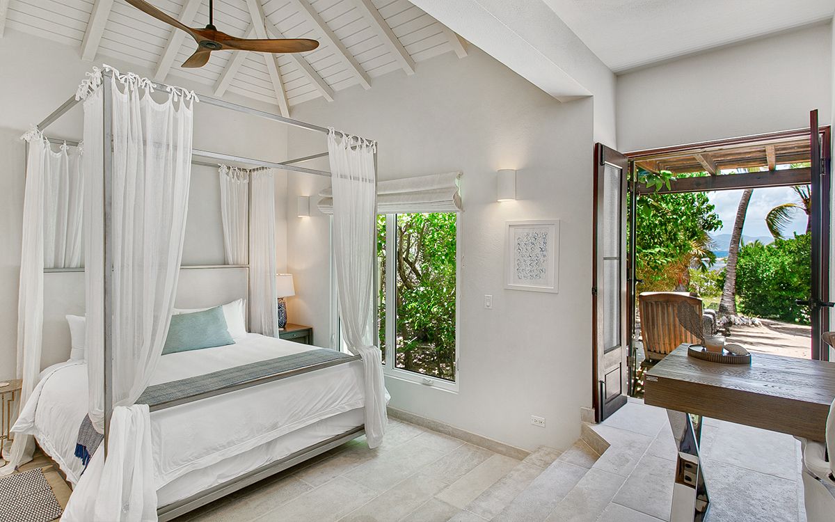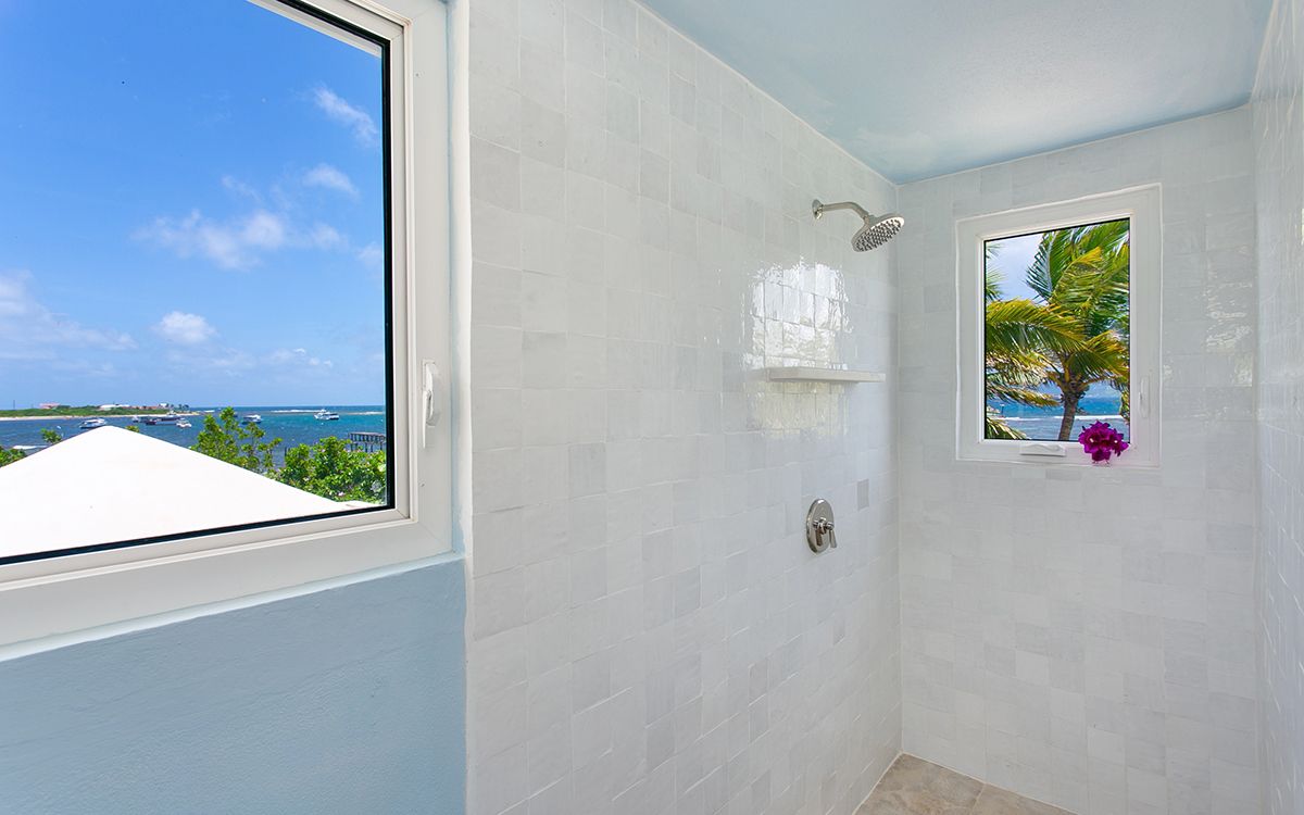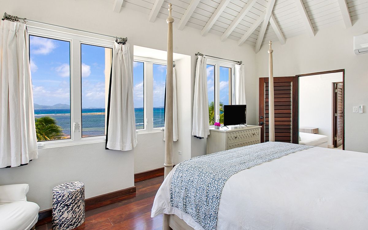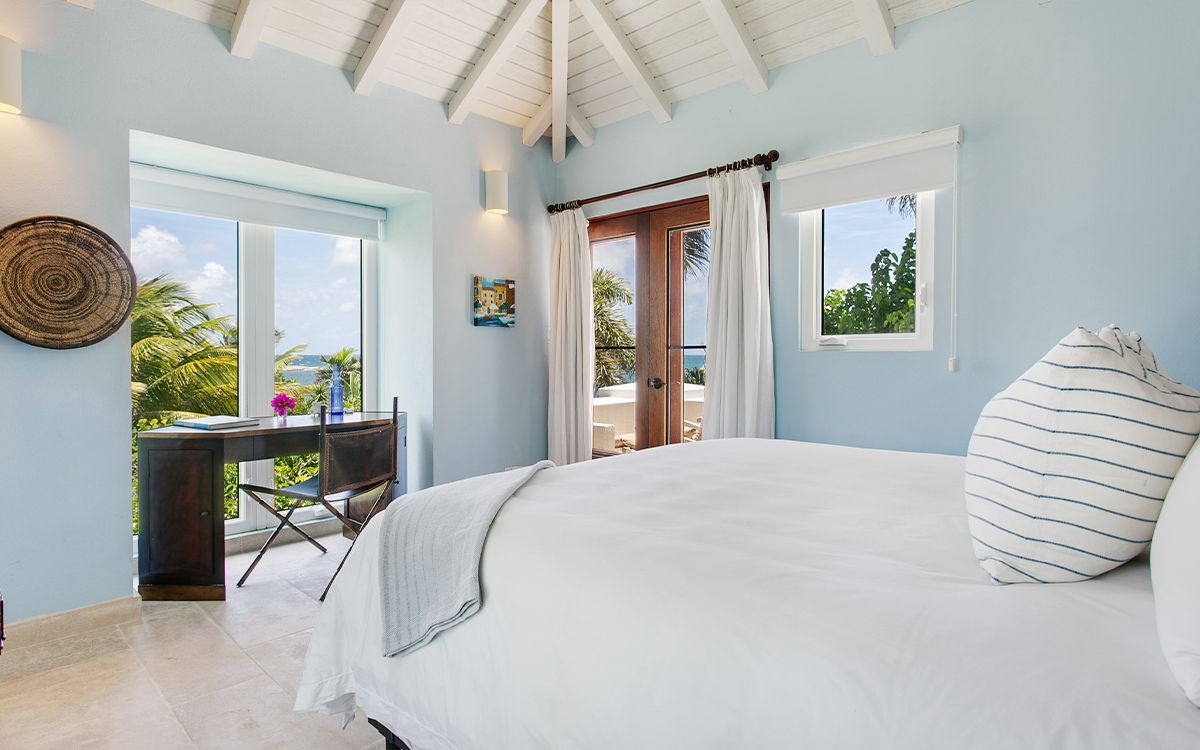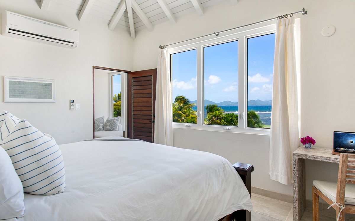 Upper level: En-suite bathroom with standalone shower, air conditioning, ceiling fan, television, view of the Caribbean Sea. Shared office that interconnects with Bedroom 1.