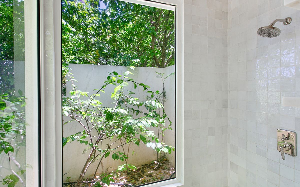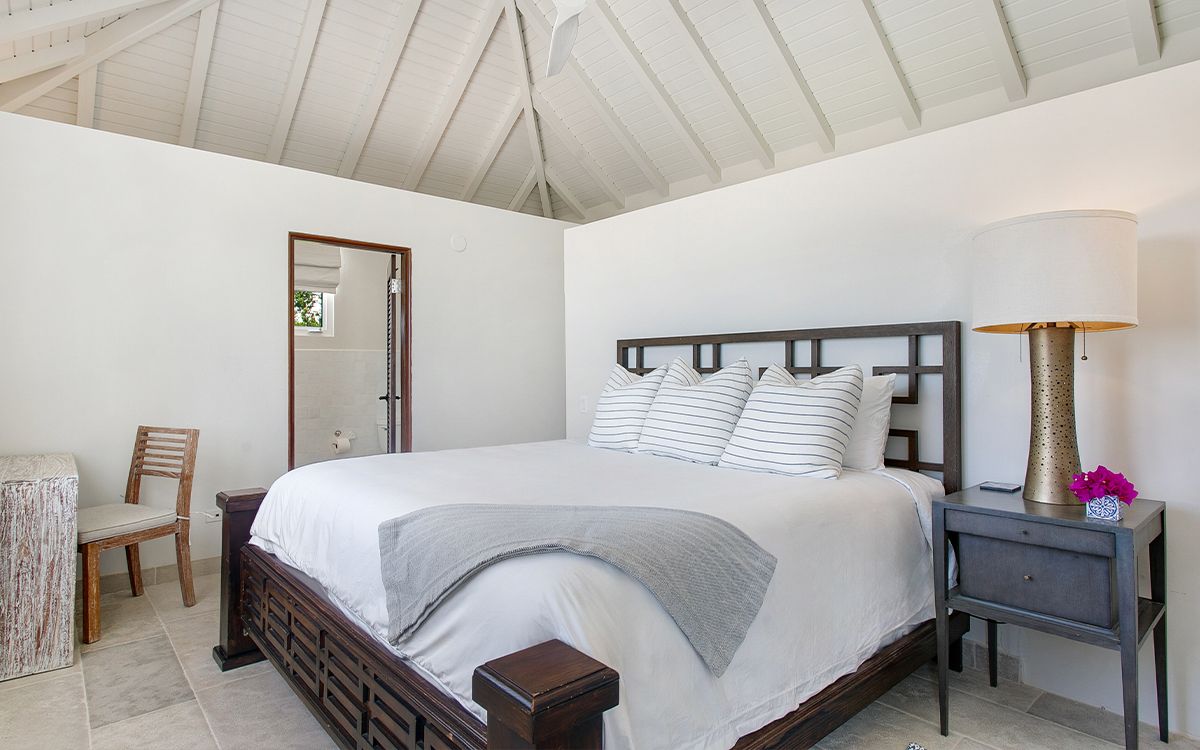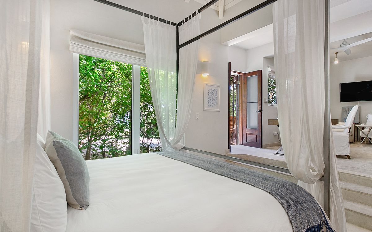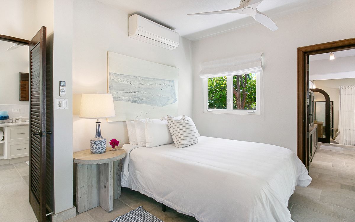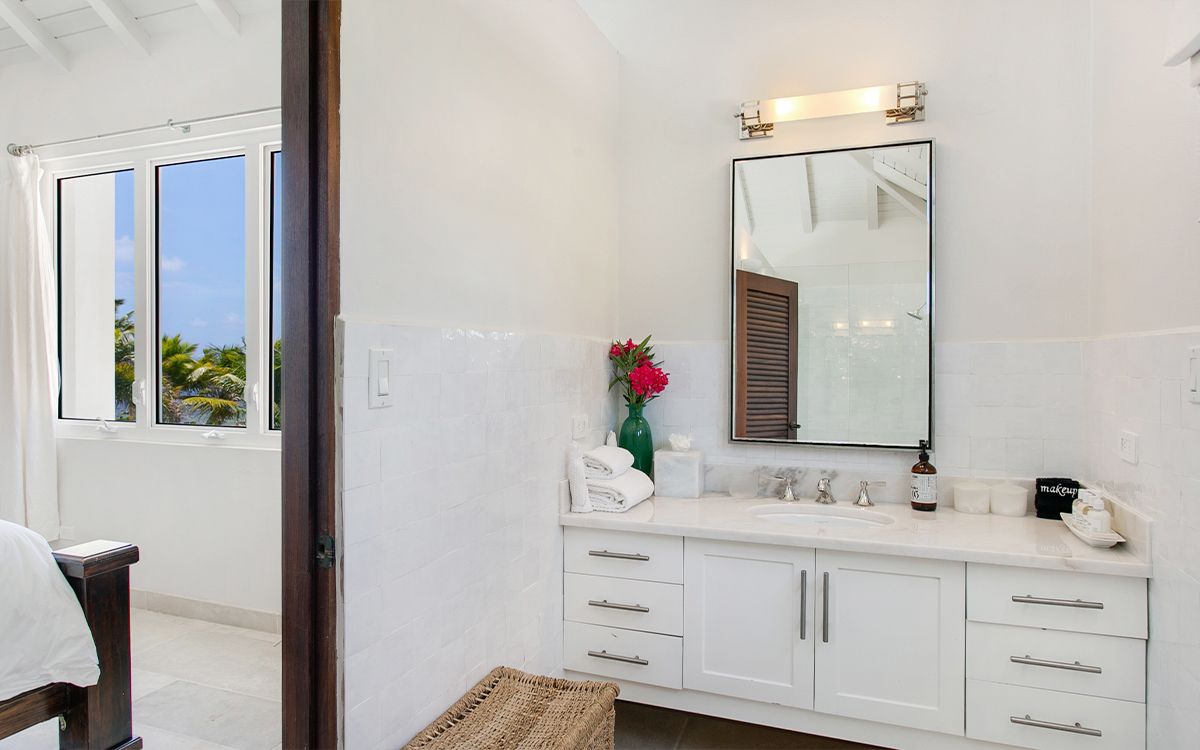 Upper level: En-suite bathroom with standalone shower, air conditioning, ceiling fan, television, view of the Caribbean Sea. Shared office that interconnects with Bedroom 1.