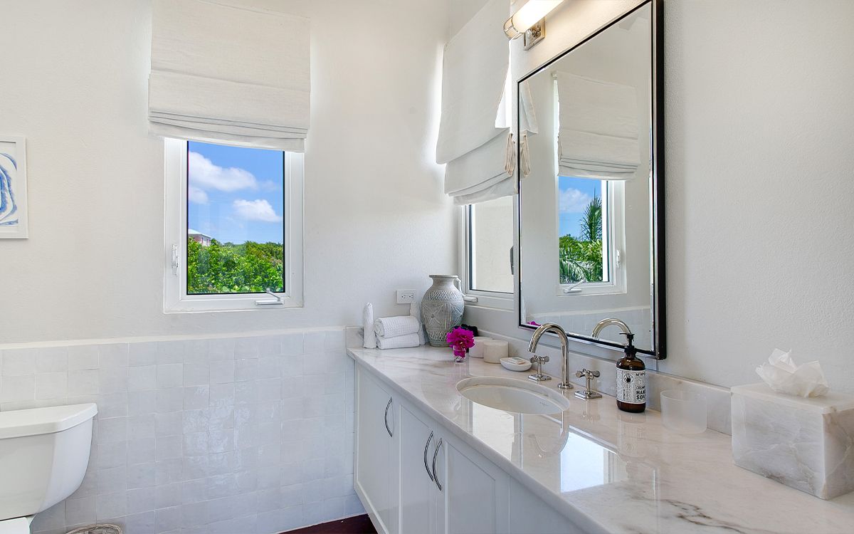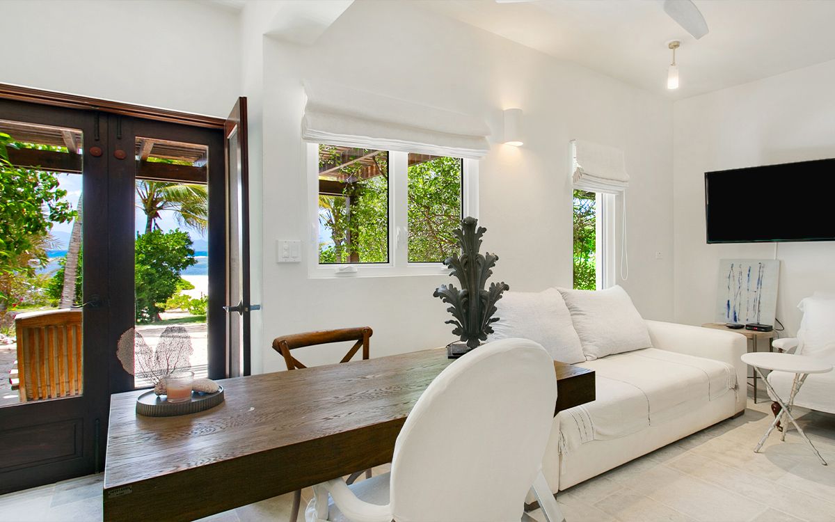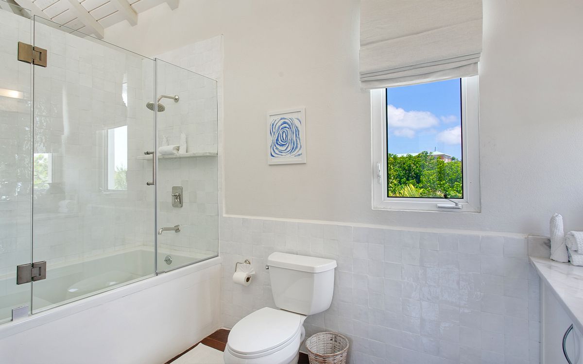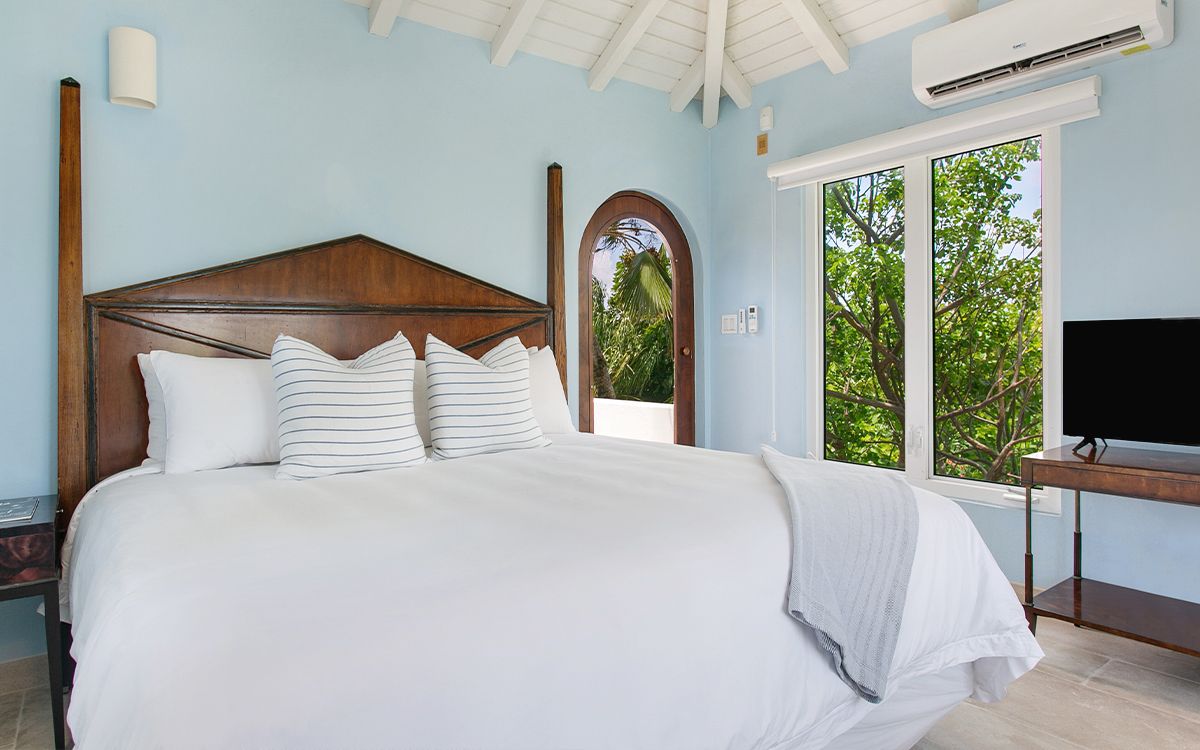 Upper level: En-suite bathroom with bathtub and shower combination, air conditioning, ceiling fan, television, private balcony overlooking the Caribbean Sea. Shared office that interconnects with Bedroom 2.