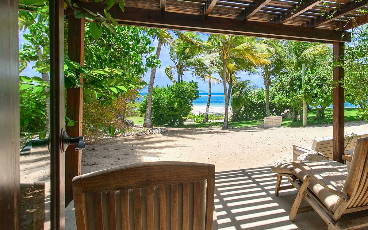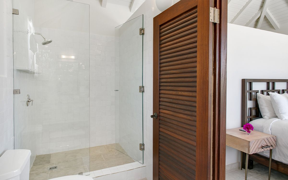 Upper level: En-suite bathroom with walk-in rain shower, air conditioning, ceiling fan, television, mini fridge, opens onto a furnished balcony overlooking the Caribbean Sea.