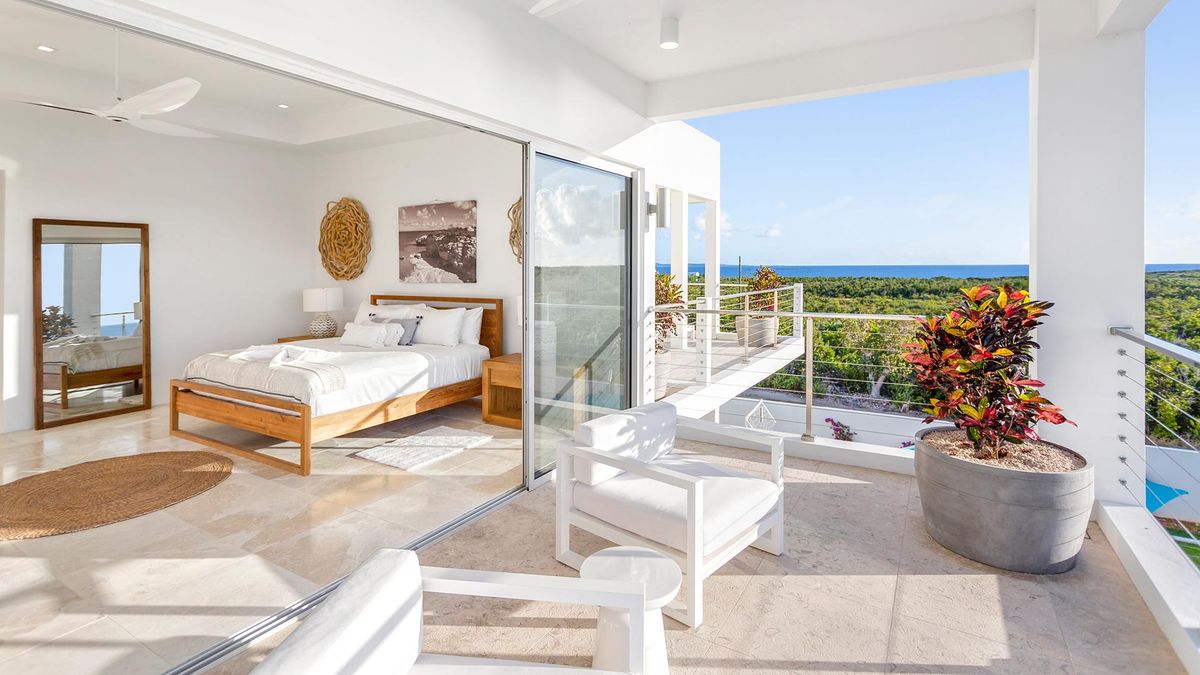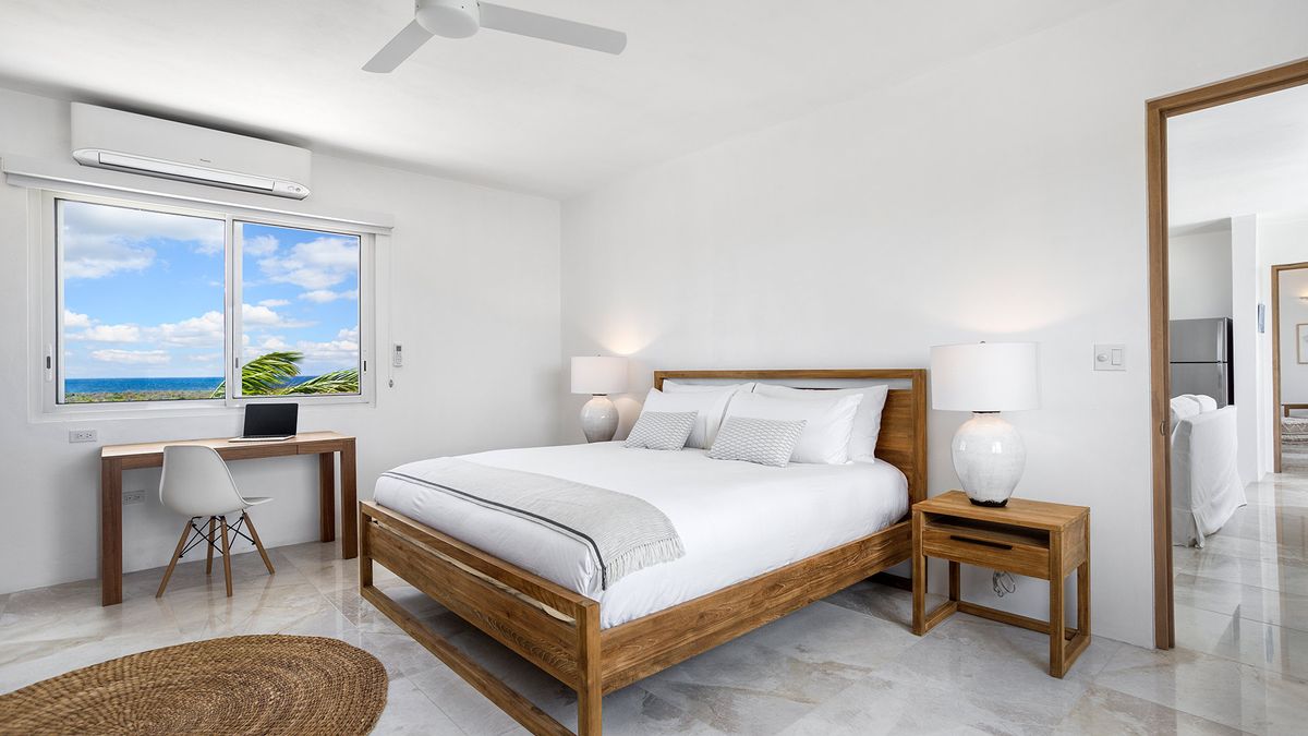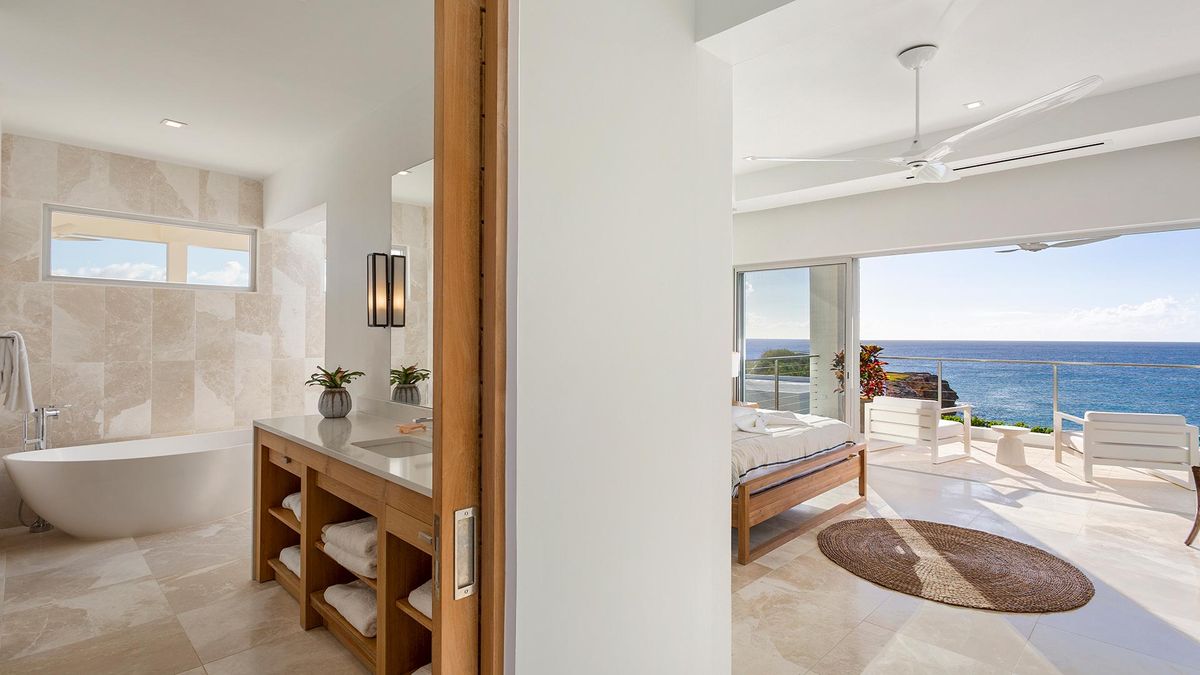 The villa rental design blends modern luxury with traditional Caribbean charm. It features high ceilings, elegant furnishings, and tasteful décor that reflects the island's natural beauty, including ceiling fans for added comfort. The use of natural materials and soft color palettes enhances the sense of serenity and comfort throughout the villa rental property.